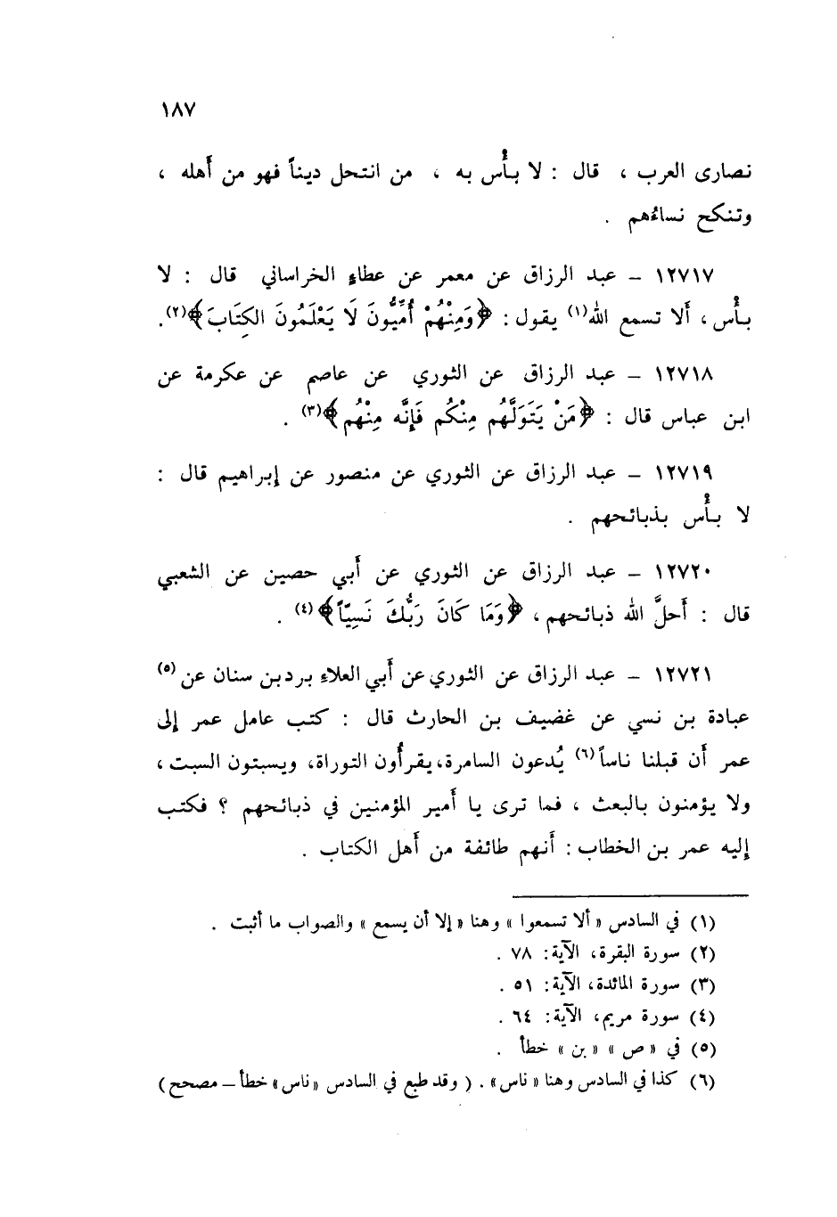 12721 - عَنِ الثَّوْرِيِّ، عَنْ أَبِي الْعَلَاءِ بُرْدِ بْنِ سِنَانٍ، عَنْ عُبَادَةَ بْنِ نَسِيٍّ، عَنْ غُضَيْفِ بْنِ الْحَارِثِ قَالَ: كَتَبَ عَامِلُ عُمَرَ إِلَى عُمَرَ، أَنَّ قِبَلَنَا نَاسًا يُدْعَوْنَ السَّامِرَةَ يَقْرَأُونَ التَّوْرَاةَ، وَيَسْبِتُونَ السَّبْتَ، وَلَا يُؤْمِنُونَ بِالْبَعْثِ، فَمَا تَرَى يَا أَمِيرَ الْمُؤْمِنِينَ فِي ذَبَائِحِهِمْ؟ فَكَتَبَ إِلَيْهِ عُمَرُ بْنُ الْخَطَّابِ: «§أَنَّهُمْ طَائِفَةٌ مِنْ أَهْلِ الْكِتَابِ»