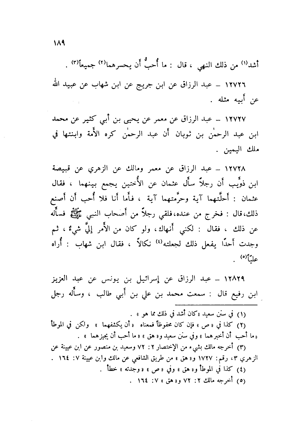 12728 - عَنْ مَعْمَرٍ، وَمَالِكٍ، عَنِ الزُّهْرِيِّ، عَنْ قَبِيصَةَ بْنِ ذُؤَيْبٍ، أَنَّ رَجُلًا سَأَلَ عُثْمَانَ عَنِ الْأُخْتَيْنِ يُجْمَعُ بَيْنَهُمَا، فَقَالَ عُثْمَانُ: «أَحَلَّتْهُمَا آيَةٌ، وَحَرَّمَتْهُمَا آيَةٌ، فَأَمَّا أَنَا فَلَا أُحِبُّ أَنْ أَصْنَعَ ذَلِكَ» قَالَ: فَخَرَجَ مِنْ عِنْدِهِ فَلَقِي رَجُلًا مِنْ أَصْحَابِ النَّبِيِّ صَلَّى اللهُ عَلَيْهِ وَسَلَّمَ فَسَأَلَهُ عَنْ ذَلِكَ فَقَالَ: «لَكِنِّي §أَنْهَاكَ وَلَوْ كَانَ مِنَ الْأَمْرِ إِلَيَّ شَيْءٌ، ثُمَّ وَجَدْتُ أَحَدًا يَفْعَلُ ذَلِكَ لَجَعَلْتُهُ نَكَالًا». فَقَالَ ابْنُ شِهَابٍ: " أُرَاهُ عَلِيًّا