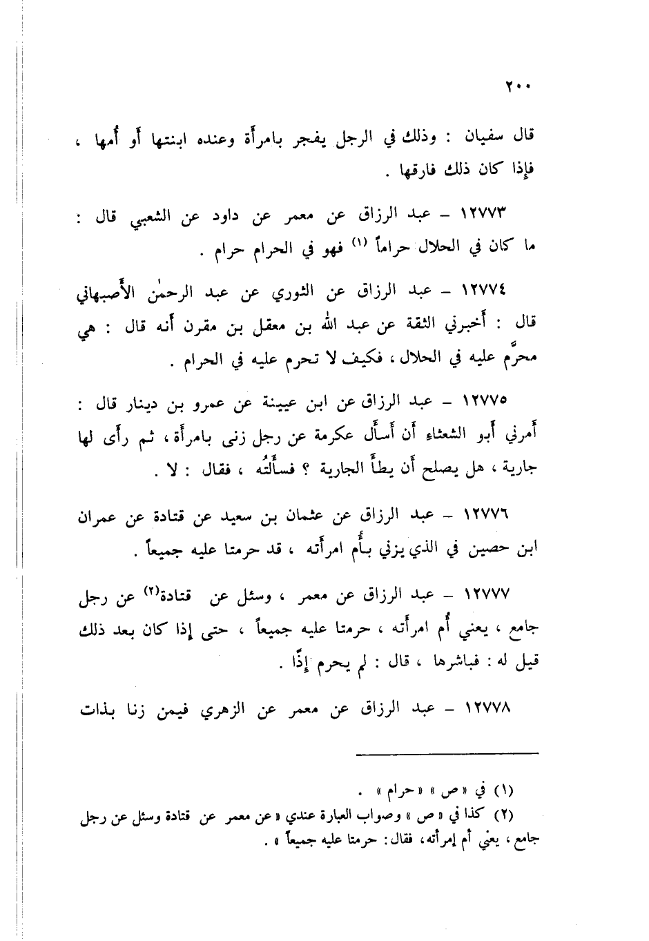 12779 - عَبْدُ الرَّزَّاقِ قَالَ: أَخْبَرَنَا ابْنُ جُرَيْجٍ قَالَ: أُخْبِرْتُ عَنِ الْحَارِثِ بْنِ عَبْدِ الرَّحْمَنِ بْنِ أَبِي ذُبَابٍ، أَنَّهُ سُئِلَ عَنْ رَجُلٍ فَجَرَ بِأُمِّ الْمَرْأَةِ، ثُمَّ يُرِيدُ أَنْ يَتَزَوَّجَ ابْنَتَهَا أَوْ يَفْجُرَ بِابْنَتِهَا، ثُمَّ يُرِيدُ أَنْ يَتَزَوَّجَ أُمَّهَا قَالَ: «§لَا يُحَرِّمُ حَرَامٌ حَلَالَا» ثُمَّ جِئْتُ عُرْوَةَ فَسَأَلْتُهُ عَنْ ذَلِكَ، فَقَالَ مِثْلَ قَوْلِ ابْنِ الْمُسَيِّبِ