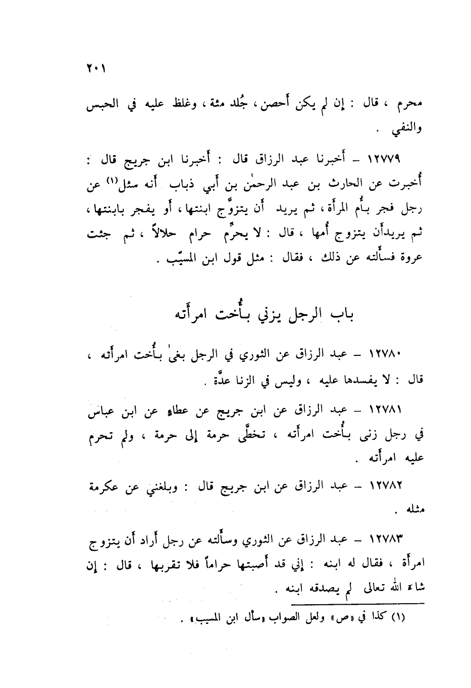 12784 - عَنِ ابْنِ جُرَيْجٍ قَالَ: أُخْبِرْتُ، عَنْ أَبِي بَكْرِ بْنِ عَبْدِ الرَّحْمَنِ بْنِ أُمِّ الْحَكَمِ، أَنَّهُ قَالَ: قَالَ رَجُلٌ: يَا رَسُولَ اللَّهِ، إِنِّي زَنَيْتُ بِامْرَأَةٍ فِي الْجَاهِلِيَّةِ وَابْنَتِهَا، فَقَالَ النَّبِيُّ صَلَّى اللهُ عَلَيْهِ وَسَلَّمَ: " لَا أَرَى ذَلِكَ، §وَلَا يَصْلُحُ ذَلِكَ: أَنْ تَنْكِحَ امْرَأَةً تَطَّلِعُ مِنَ ابْنَتِهَا عَلَى مَا اطَّلَعْتَ عَلَيْهِ مِنْهَا "