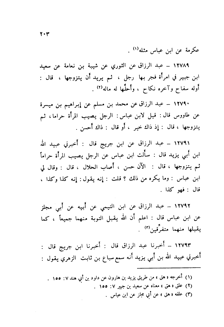 12791 - عَنِ ابْنِ جُرَيْجٍ قَالَ: أَخْبَرَنِي عُبَيْدُ اللَّهِ بْنُ أَبِي يَزِيدَ قَالَ: سَأَلْتُ ابْنَ عَبَّاسٍ، عَنِ الرَّجُلِ يُصِيبُ الْمَرْأَةَ حَرَامًا، ثُمَّ يَتَزَوَّجُهَا قَالَ: «§الْآنَ حَسَنٌ، أَصَابَ الْحَلَالَ». قَالَ: وَقَالَ لِي ابْنُ عَبَّاسٍ: «وَمَا يُكْرَهُ مِنْ ذَلِكَ؟» قُلْتُ: إِنَّهُ يَقُولُ: إِنَّهُ كَذَا وَكَذَا قَالَ: «فَهُوَ كَذَا»