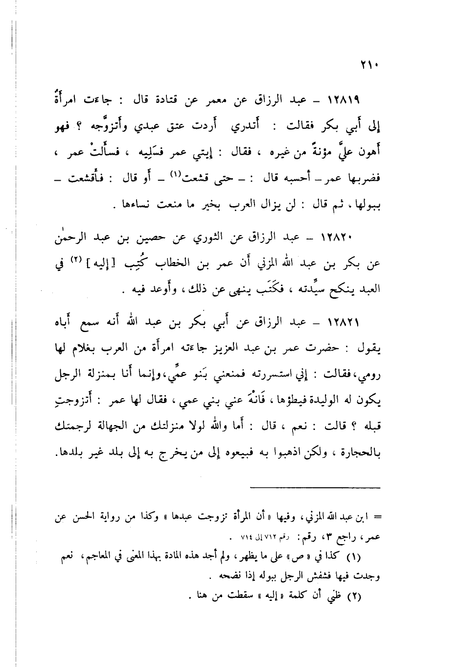 12820 - عَنِ الثَّوْرِيِّ، عَنْ حُصَيْنِ بْنِ عَبْدِ الرَّحْمَنِ، عَنْ بَكْرِ بْنِ عَبْدِ اللَّهِ الْمُزَنِيِّ، أَنَّ عُمَرَ بْنَ الْخَطَّابِ، كَتَبَ إِلَيْهِ فِي: الْعَبْدِ يَنْكِحُ سَيِّدَتَهُ، فَكَتَبَ: «§يَنْهَى عَنْ ذَلِكَ، وَأَوْعَدَ فِيهِ»