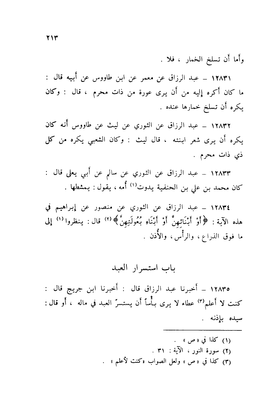 12836 - عَنْ مَعْمَرٍ، عَنْ أَيُّوبَ، عَنْ نَافِعٍ قَالَ: كَانَ ابْنُ عُمَرَ، يَرَى «§لِمَمْلُوكِهِ سَرَارِيَ لَا يَعِيبُ ذَلِكَ عَلَيْهِمْ»