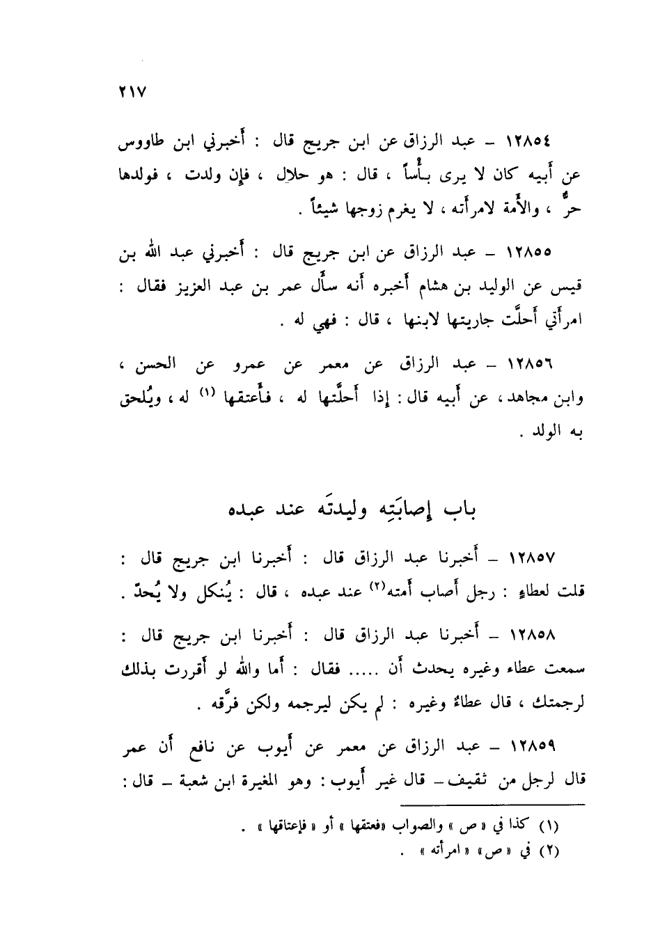 12857 - عَبْدُ الرَّزَّاقِ قَالَ: أَخْبَرَنَا ابْنُ جُرَيْجٍ قَالَ: قُلْتُ لِعَطَاءٍ: رَجُلٌ أَصَابَ أَمَتَهُ عِنْدَ عَبْدِهِ قَالَ: «§يُنَكَّلُ وَلَا يُحَدُّ»