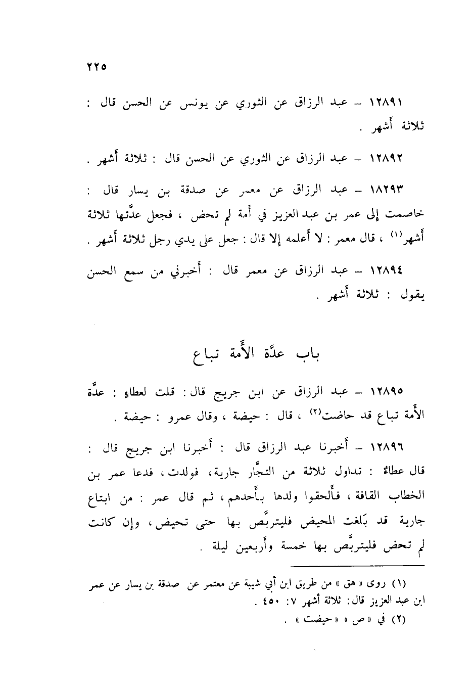 12896 - عَبْدُ الرَّزَّاقِ قَالَ: أَخْبَرَنَا ابْنُ جُرَيْجٍ قَالَ: قَالَ عَطَاءٌ: تَدَاوَلَ ثَلَاثَةٌ مِنَ التُّجَّارِ جَارِيَةً، فَوَلَدَتْ، فَدَعَا عُمَرُ بْنُ الْخَطَّابِ الْقَافَةَ، فَأَلْحَقُوا وَلَدَهَا بِأَحِدِهِمْ، ثُمَّ قَالَ عُمَرُ: «§مَنِ ابْتَاعَ جَارِيَةً قَدْ بَلَغَتِ الْمَحِيضَ، فَلْيَتَربَّصْ بِهَا حَتَّى تَحِيضَ، وَإِنْ كَانَتْ لَمْ تَحِضْ فَلْيَتَربَّصْ بِهَا خَمْسَةً وَأَرْبَعِينَ لَيْلَةً»