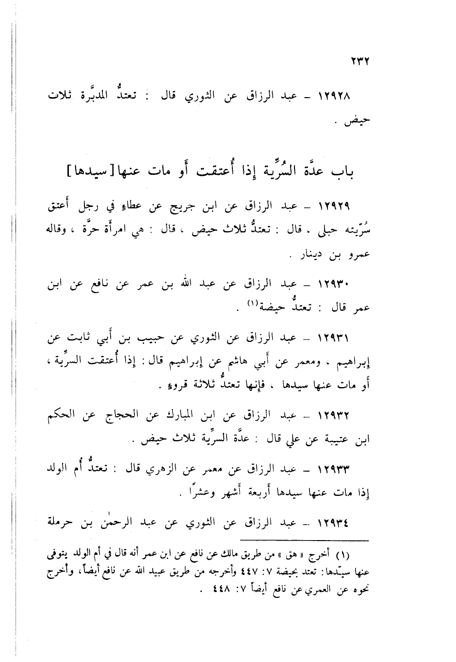 12931 - عَنِ الثَّوْرِيِّ، عَنْ حَبِيبِ بْنِ أَبِي ثَابِتٍ، عَنْ إِبْرَاهِيمَ، وَمَعْمَرٍ، عَنْ أَبِي هَاشِمٍ، عَنْ إِبْرَاهِيمَ قَالَ: «§إِذَا أُعْتِقَتِ السُّرِّيَّةُ، أَوْ مَاتَ عَنْهَا سَيِّدُهَا، فَإِنَّهَا تَعْتَدُّ ثَلَاثَةَ قُرُوءٍ»