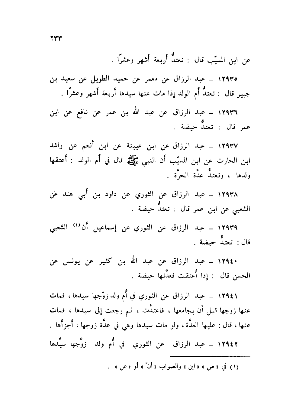 12937 - عَنِ ابْنِ عُيَيْنَةَ، عَنِ ابْنِ أَنْعَمَ، عَنْ رَاشَدِ بْنِ الْحَارِثِ، عَنِ ابْنِ الْمُسَيِّبِ، أَنَّ النَّبِيَّ صَلَّى اللهُ عَلَيْهِ وَسَلَّمَ، قَالَ فِي أُمِّ الْوَلَدِ: «§أَعْتَقَهَا وَلَدُهَا، وَتَعْتَدُّ عِدَّةَ الْحُرَّةِ»