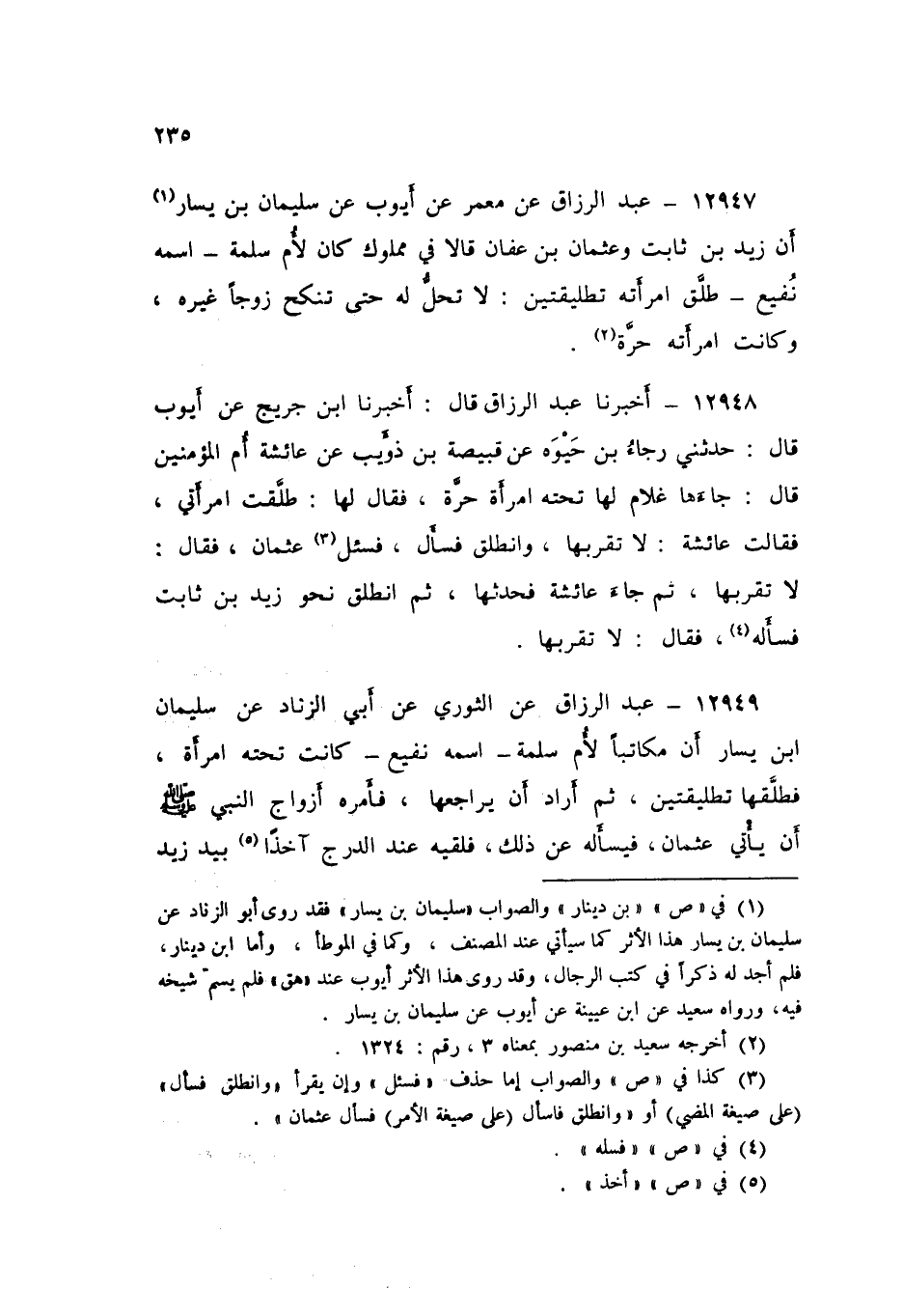 12949 - عَنِ الثَّوْرِيِّ، عَنْ أَبِي الزِّنَادِ، عَنْ سُلَيْمَانَ بْنِ يَسَارٍ، أَنَّ مُكَاتَبًا لِأُمِّ سَلَمَةَ اسْمُهُ نُفَيْعٌ كَانَتْ تَحْتَهُ امْرَأَةٌ، فَطَلَّقَهَا تَطْلِيقَتَيْنِ، ثُمَّ أَرَادَ أَنْ يُرَاجِعَهَا، فَأَمَرَهُ أَزْوَاجُ النَّبِيِّ صَلَّى اللهُ عَلَيْهِ وَسَلَّمَ أَنْ يَأْتِيَ عُثْمَانَ، فَيسَأَلَهُ عَنْ ذَلِكَ، فَلَقِيَهُ عِنْدَ الدَّرَجِ آخِذًا بِيَدِ زَيْدِ بْنِ ثَابِتٍ، فَسَأَلَهُمَا فَابْتَدَرَاهُ جَمِيعًا، فَقَالَا: «§حَرُمَتْ عَلَيْكَ حَتَّى تَنْكِحَ زَوْجًا غَيْرَكَ». إِلَّا أَنَّ الثَّوْرِيَّ قَالَ: «لَقِيَهُمَا وَهُمَا مُتَخَاصِرَانِ»