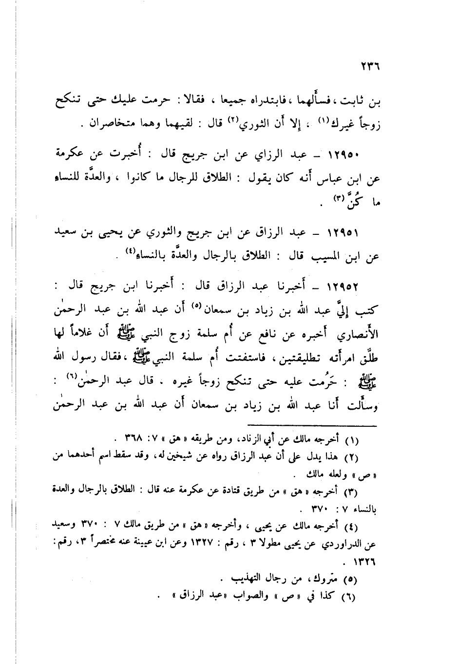 12952 - عَبْدُ الرَّزَّاقِ قَالَ: أَخْبَرَنَا ابْنُ جُرَيْجٍ قَالَ: كَتَبَ إِلَيَّ عَبْدُ اللَّهِ بْنُ زِيَادِ بْنِ سَمْعَانَ، أَنَّ عَبْدَ اللَّهِ بْنَ عَبْدِ الرَّحْمَنِ الْأَنْصَارِيَّ، أَخْبَرَهُ، عَنْ نَافِعٍ، عَنْ أُمِّ سَلَمَةَ - زَوْجِ النَّبِيِّ صَلَّى اللهُ عَلَيْهِ وَسَلَّمَ -، أَنَّ غُلَامًا لَهَا طَلَّقَ امْرَأَتَهُ تَطْلِيقَتَيْنِ، فَاسْتَفْتَتْ أُمُّ سَلَمَةَ النَّبِيَّ صَلَّى اللهُ عَلَيْهِ وَسَلَّمَ، فَقَالَ رَسُولُ اللَّهِ صَلَّى اللهُ عَلَيْهِ وَسَلَّمَ: «§حَرُمُتْ عَلَيْهِ حَتَّى تَنْكِحَ زَوْجًا غَيْرَهُ». قَالَ عَبْدُ الرَّحْمَنِ، وَسَأَلتُ أَنَا عَبْدَ اللَّهِ بْنَ زِيَادِ بْنِ سَمْعَانَ، أَنَّ عَبْدَ اللَّهِ بْنَ عَبْدِ الرَّحْمَنِ الْأَنْصَارِيَّ أَخْبَرَهُ عَنْ نَافِعٍ، عَنْ أُمِّ سَلَمَةَ ثُمَّ ذَكَرَ مِثْلَهُ