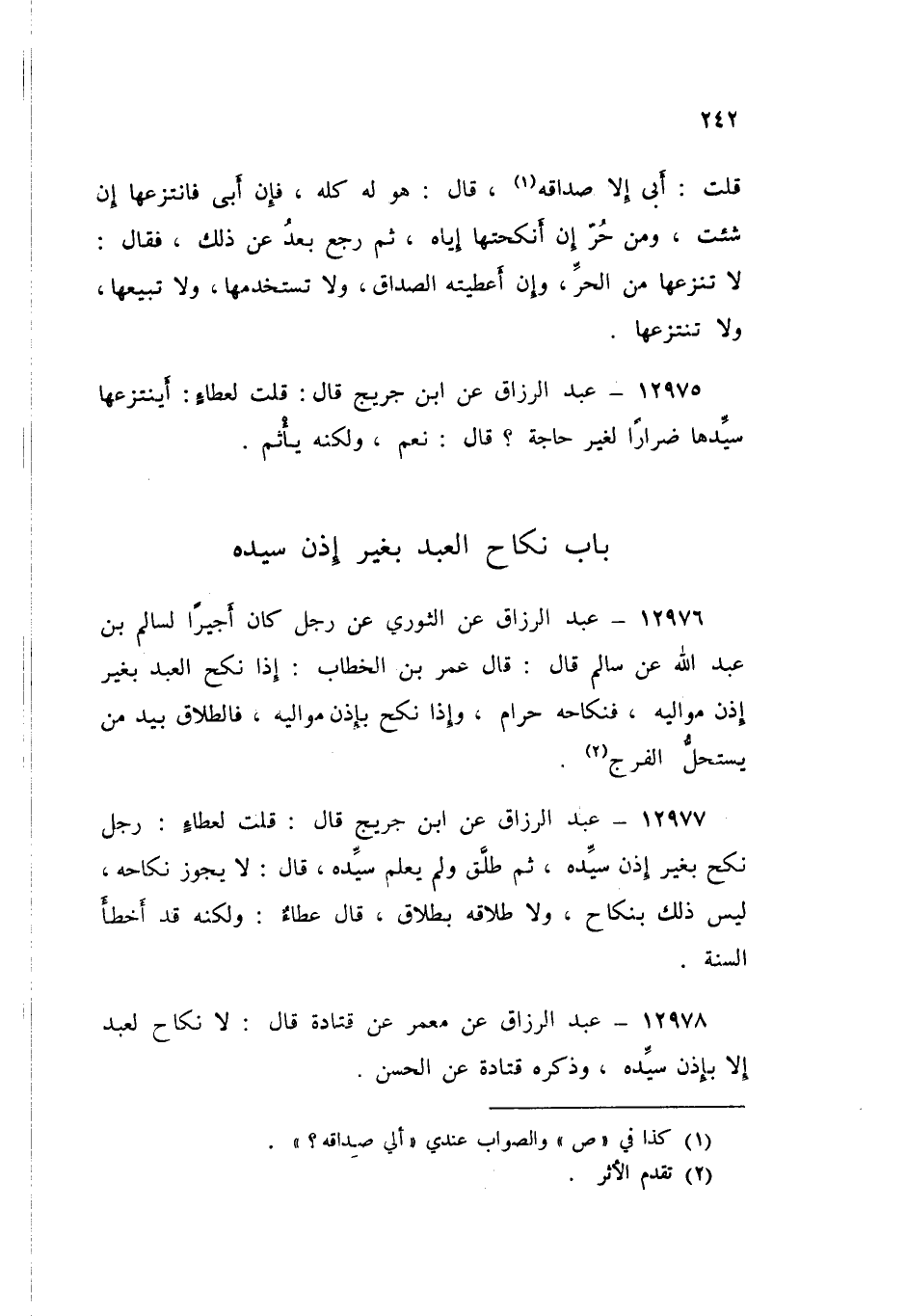 12977 - عَنِ ابْنِ جُرَيْجٍ قَالَ: قُلْتُ لِعَطَاءٍ: رَجُلٌ نَكَحَ بِغَيْرِ إِذْنِ سَيِّدِهِ، ثُمَّ طَلَّقَ وَلَمْ يَعْلَمْ سَيِّدُهُ قَالَ: «§لَا يَجُوزُ نِكَاحُهُ، لَيْسَ ذَلِكَ بِنِكَاحٍ، وَلَا طَلَاقُهُ بِطَلَاقٍ» قَالَ عَطَاءٌ: «وَلَكِنَّهُ قَدْ أَخْطَأَ السُّنَّةَ»