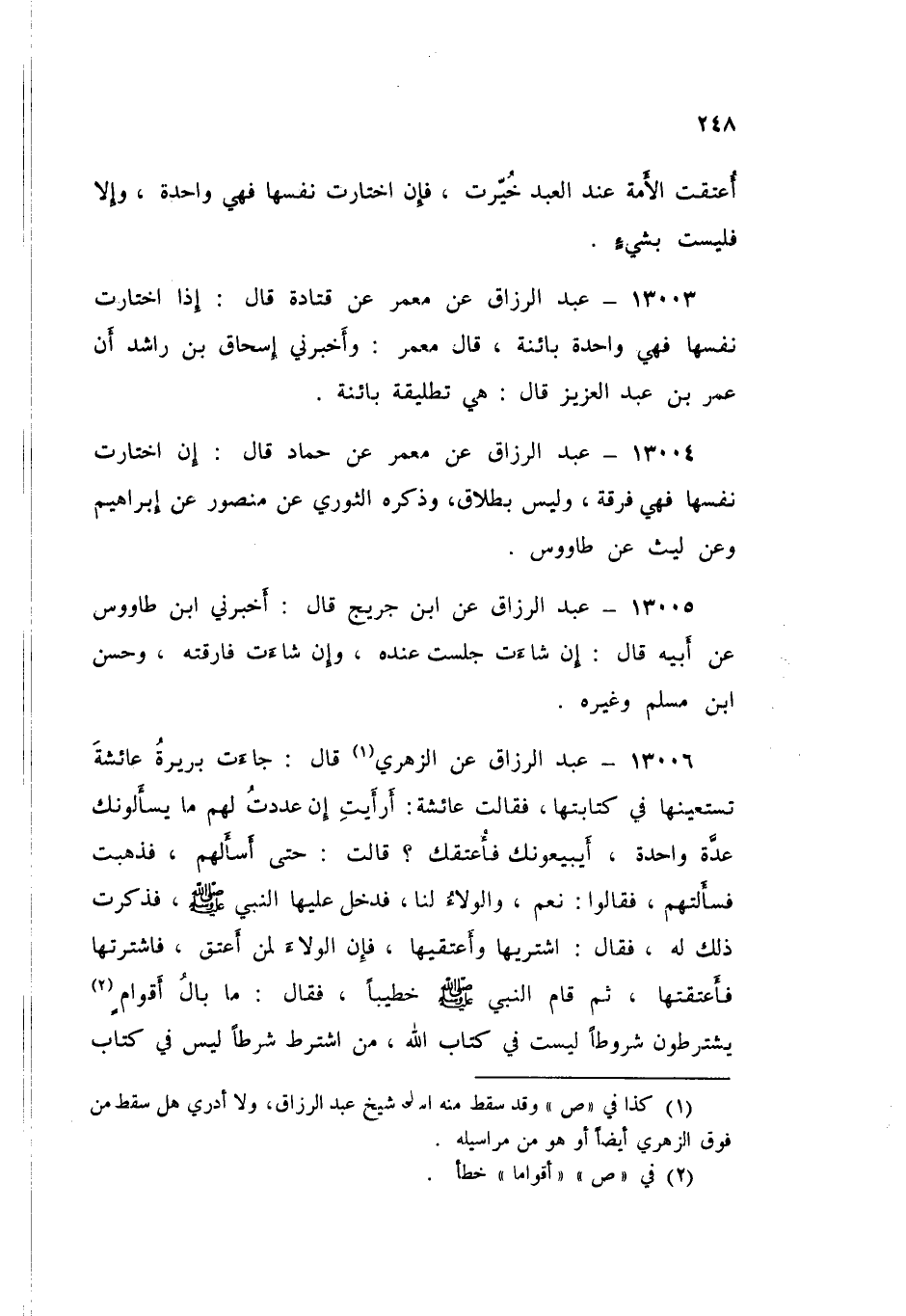 13006 - عَنِ الزُّهْرِيِّ قَالَ: جَاءَتْ بَرِيرَةُ عَائِشَةَ تَسْتَعِينُهَا فِي كِتَابَتِهَا، فَقَالَتْ عَائِشَةُ: أَرَأَيْتَ إِنْ عَدَدْتَ لَهُمْ مَا يَسْأَلُونَكَ عِدَّةً وَاحِدَةً، أَيَبِيعُونَكَ فَأَعْتِقُكَ؟ قَالَتْ: حَتَّى أَسْأَلَهُمْ فَذَهَبَتْ فَسَأَلَتْهُمْ فَقَالُوا: نَعَمْ، وَالْوَلَاءُ لَنَا، فَدَخَلَ عَلَيْهَا النَّبِيُّ صَلَّى اللهُ عَلَيْهِ وَسَلَّمَ، فَذَكَرَتْ ذَلِكَ لَهُ، فَقَالَ: «اشْتَرِيهَا وَأَعْتِقِيهَا، §فَإِنَّ الْوَلَاءَ لِمَنْ أَعْتَقَ»، فَاشْتَرَتْهَا فَأَعْتَقَتْهَا، ثُمَّ قَامَ النَّبِيُّ صَلَّى اللهُ عَلَيْهِ وَسَلَّمَ خَطِيبًا، فَقَالَ: «مَا بَالُ أَقْوَامٍ يَشْتَرِطُونَ شُرُوطًا لَيْسَتْ فِي كِتَابِ اللَّهِ، مَنِ اشْتَرَطَ شَرْطًا لَيْسَ فِي كِتَابِ اللَّهِ، فَشَرْطُهُ ذَلِكَ بَاطِلٌ، وَإِنِ اشْتَرَطَ مِائَةَ شَرْطٍ، شَرْطُ اللَّهِ أَحَقُّ وَأَوْثَقُ»
