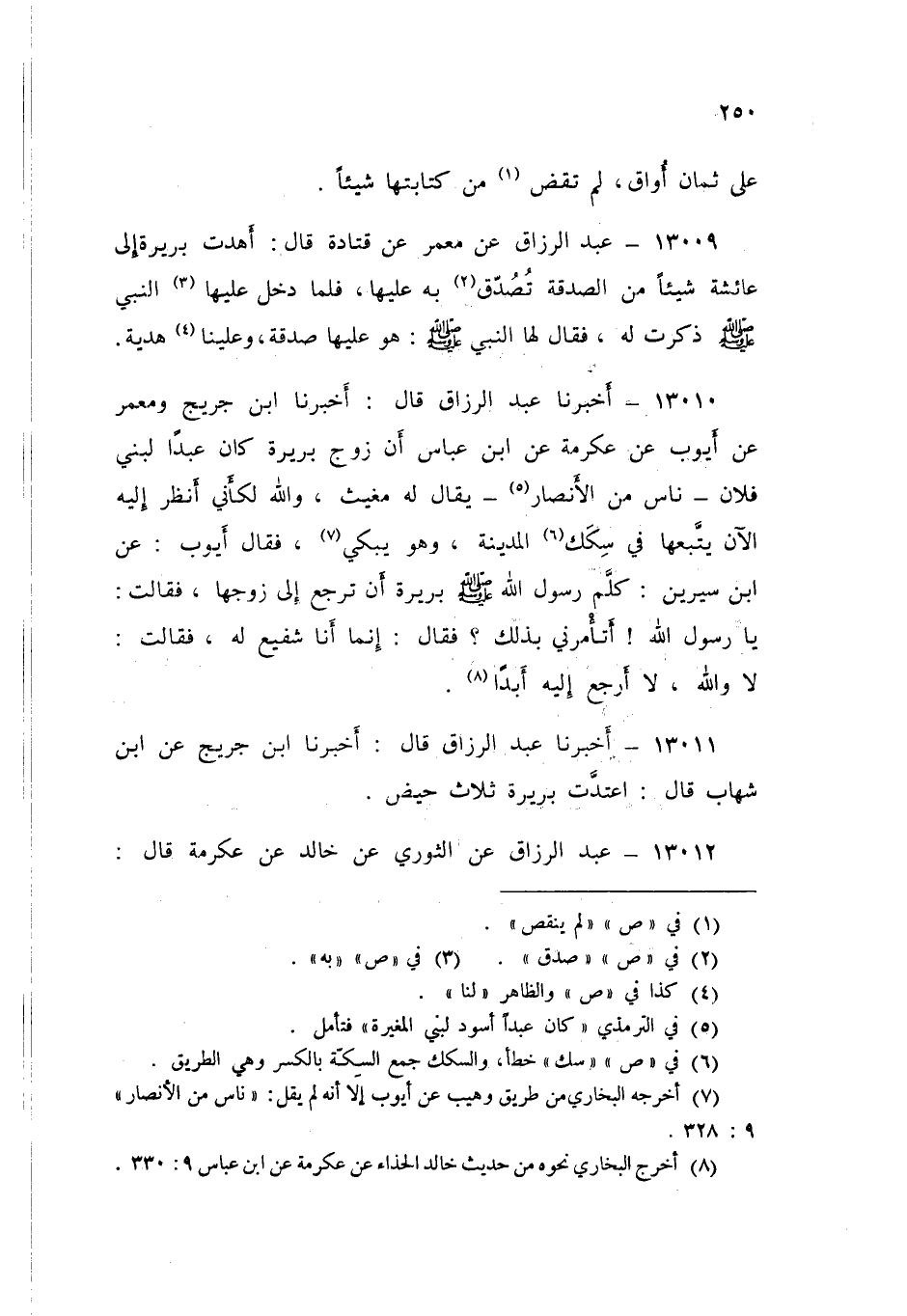 13010 - عَبْدُ الرَّزَّاقِ قَالَ: أَخْبَرَنَا ابْنُ جُرَيْجٍ، وَمَعْمَرٌ، عَنْ أَيُّوبَ، عَنْ عِكْرِمَةَ، عَنِ ابْنِ عَبَّاسٍ، أَنَّ زَوْجَ بَرِيرَةَ كَانَ عَبْدًا لِبَنِي فُلَانٍ - نَاسٌ مِنَ الْأَنْصَارِ - يُقَالُ لَهُ: مُغِيثٌ، وَاللَّهِ، لَكَأَنِّي أَنْظُرُ إِلَيْهِ الآن يَتْبَعُهَا فِي سِكَكِ الْمَدِينَةِ وَهُوَ يَبْكِي، فَقَالَ أَيُّوبُ، عَنِ ابْنِ سِيرِينَ كَلَّمَ رَسُولُ اللَّهِ صَلَّى اللهُ عَلَيْهِ وَسَلَّمَ بَرِيرَةَ أَنْ تَرْجِعَ إِلَى زَوْجِهَا، فَقَالَتْ: يَا رَسُولُ اللَّهِ، أَتَأَمْرُنِي بِذَلِكَ؟ فَقَالَ: «§إِنَّمَا أَنَا شَفِيعٌ لَهُ». فَقَالَتْ: لَا وَاللَّهِ لَا أَرْجِعُ إِلَيْهِ أَبَدًا