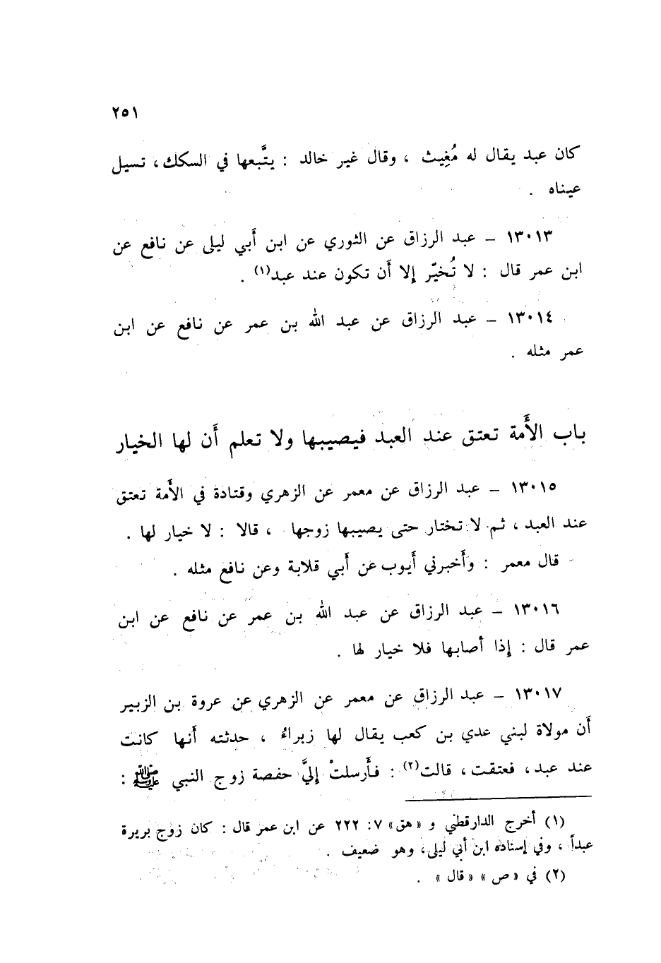 13017 - عَنْ مَعْمَرٍ، عَنِ الزُّهْرِيِّ، عَنْ عُرْوَةَ بْنِ الزُّبَيْرِ، أَنَّ مَوْلَاةً لِبَنِي عَدِيِّ بْنِ كَعْبٍ - يُقَالُ لَهَا: زَبْرَاءُ - حَدَّثَتْهُ أَنَّهَا §كَانَتْ عِنْدَ عَبْدٍ، فَعُتِقَتْ. قَالَتْ: فَأَرْسَلَتْ إِلَيَّ حَفْصَةُ - زَوْجُ النَّبِيِّ صَلَّى اللهُ عَلَيْهِ وَسَلَّمَ - أَنِّي مُخْبِرَتُكِ بِخَبَرٍ، وَلَا أُحِبُّ أَنْ تَصْنَعِي شَيْئًا: إِنَّ أَمْرَكِ بِيَدِكِ حَتَّى يَمَسَّكِ زَوْجُكِ، فَإِذَا مَسَّكَ فَلَيْسَ لَكِ. قَالَتْ: قُلْتُ: «فَهُوَ الطَّلَاقُ، فَهُوَ الطَّلَاقُ، فَهُوَ الطَّلَاقُ». وَأَمَّا ابْنُ عُيَيْنَةَ، فَذَكَرَهُ عَنِ الزُّهْرِيِّ، عَنْ سَالِمٍ، عَنْ زَبْرَاءَ