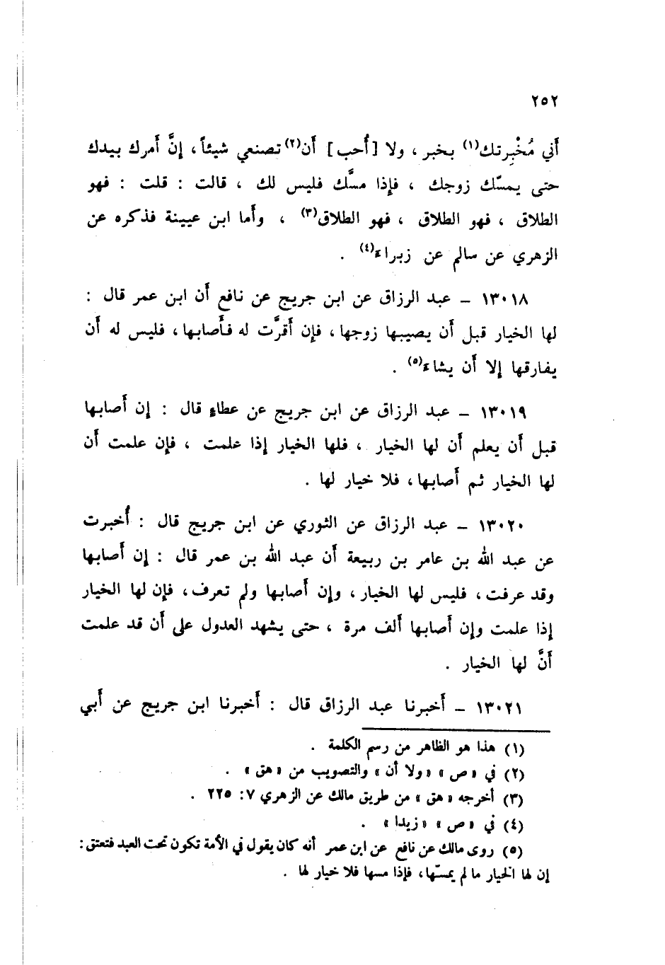 13021 - عَبْدُ الرَّزَّاقِ قَالَ: أَخْبَرَنَا ابْنُ جُرَيْجٍ، عَنْ أَبِي النَّضْرِ، عَنِ ابْنِ الْمُسَيِّبِ قَالَ: «§إِنْ أُعْتِقَتْ وَزَوْجُهَا مَمْلُوكٌ، فَبَادَرَ إِلَيْهَا فَأَصَابَهَا قَبْلَ أَنْ تَعْلَمَ أَنَّ لَهَا الْخِيَارَ فَلَهَا الْخِيَارُ إِذَا عَلِمَتْ، وَلَوْ وَلَيْتَ لَضَرَبْتُهُ ضَرْبًا أُولِمُ مِنْهُ كَتِفَيْهِ»