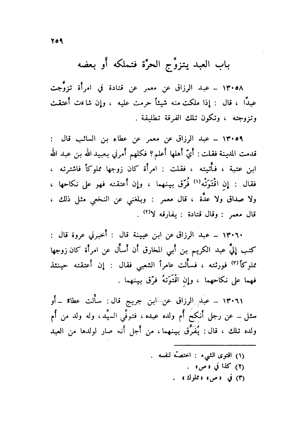 13060 - عَنِ ابْنِ عُيَيْنَةَ قَالَ: أَخْبَرَنِي عُرْوَةُ قَالَ: كَتَبَ إِلَيَّ عَبْدُ الْكَرِيمِ بْنُ أَبِي الْمُخَارِقِ أَنْ أَسْأَلَ عَنِ امْرَأَةٍ كَانَ زَوْجُهَا مَمْلُوكًا، فَوَرِثَتْهُ، فَسَأَلَتْ عَامِرًا الشَّعْبِيَّ، فَقَالَ: «§إِنْ أَعْتَقَتْهُ حِينَئِذٍ فَهُمَا عَلَى نِكَاحِهِمَا، وَإِنِ اقْتَوَتْهُ فُرِّقَ بَيْنَهُمَا»