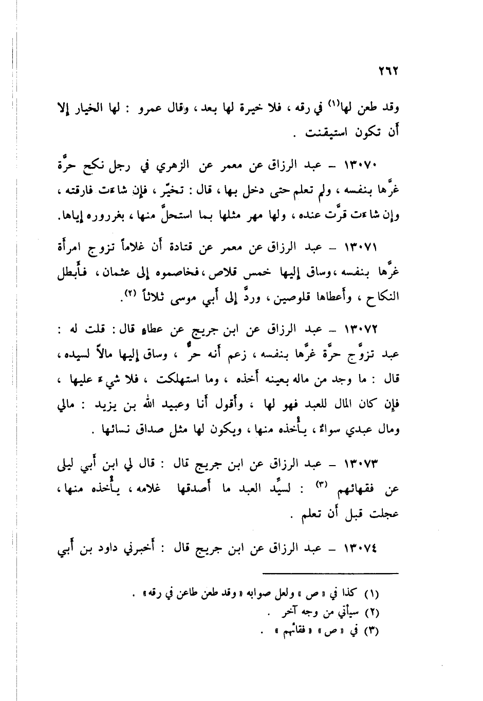 13074 - عَنِ ابْنِ جُرَيْجٍ قَالَ: أَخْبَرَنِي دَاوُدُ بْنُ أَبِي هِنْدٍ، عَنْ عَامِرٍ الشَّعْبِيِّ، أَوْ عَبْدِ اللَّهِ بْنِ قَيْسٍ، «§كَانَ غُلَامٌ لِأَبِي مُوسَى رَاعٍ فَغَرَّ حُرَّةً، فَتَزَوَّجَهَا بِغَيْرِ إِذْنِ أَبِي مُوسَى، وَأَصْدَقَهَا خَمْسَ ذَوْدٍ مِنْ إِبِلِ أَبِي مُوسَى، فَأَعْطَاهَا عُثْمَانُ بَعِيرَيْنِ، وَرَدَّ إِلَيْهِ ثَلَاثَةَ أَبْعِرَةٍ». «وَكَانَتْ مَوْلَاةً لِأَبِي جَعْدَةَ، فَأَخْبَرَتْ أَنَّ غُلَامَ أَبِي مُوسَى أَفْلَحَ»