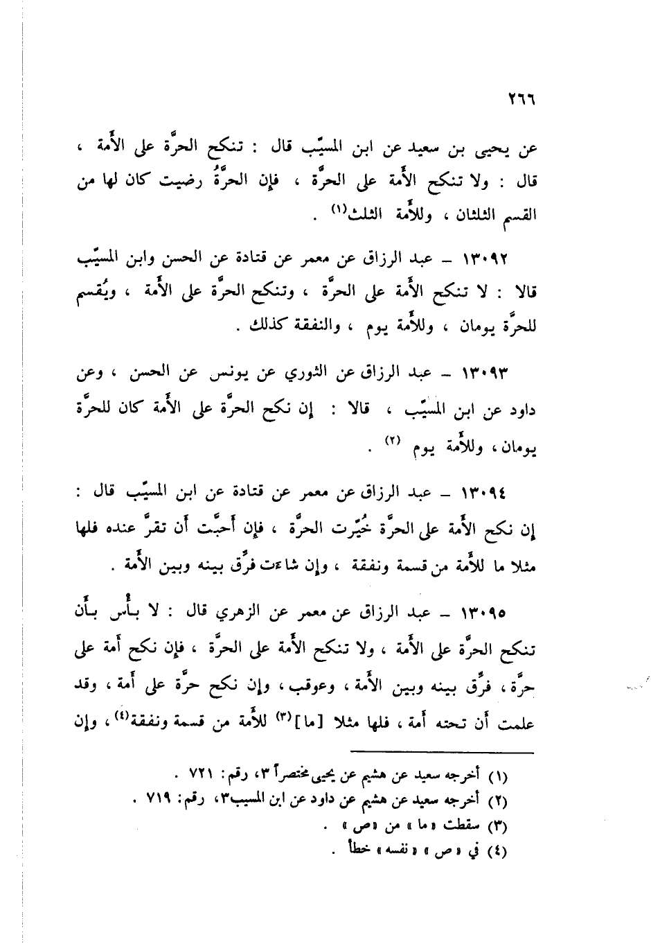13094 - عَنْ مَعْمَرٍ، عَنْ قَتَادَةَ، عَنِ ابْنِ الْمُسَيِّبِ قَالَ: «§إِنْ نَكَحَ الْأَمَةَ عَلَى الْحُرَّةِ خُيِّرَتِ الْحُرَّةُ، فَإِنْ أَحَبَّتْ أَنْ تُقِرَّ عِنْدَهُ فَلَهَا مِثْلَ مَا لِلْأَمَةِ مِنْ قِسْمَةٍ وَنَفَقَةٍ، وَإِنْ شَاءَتْ فُرِّقَ بَيْنَهُ وَبَيْنَ الْأَمَةِ».