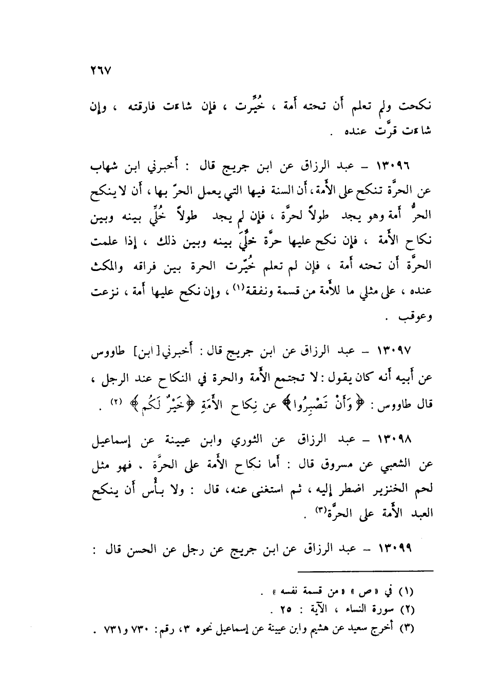 13098 - عَبْدُ الرَّزَّاقِ، عَنِ الثَّوْرِيِّ، وَابْنِ عُيَيْنَةَ، عَنْ إِسْمَاعِيلَ، عَنِ الشَّعْبِيِّ، عَنْ مَسْرُوقٍ قَالَ: «أَمَّا نِكَاحُ الْأَمَةِ عَلَى الْحُرَّةِ فَهُوَ مِثْلُ لَحْمِ الْخَنْزِيرِ، اضْطُرَّ إِلَيْهِ، ثُمَّ اسْتَغْنَى عَنْهُ» قَالَ: «§وَلَا بَأَسَ أَنْ يَنْكِحَ الْعَبْدُ الْأَمَةَ عَلَى الْحُرَّةِ»