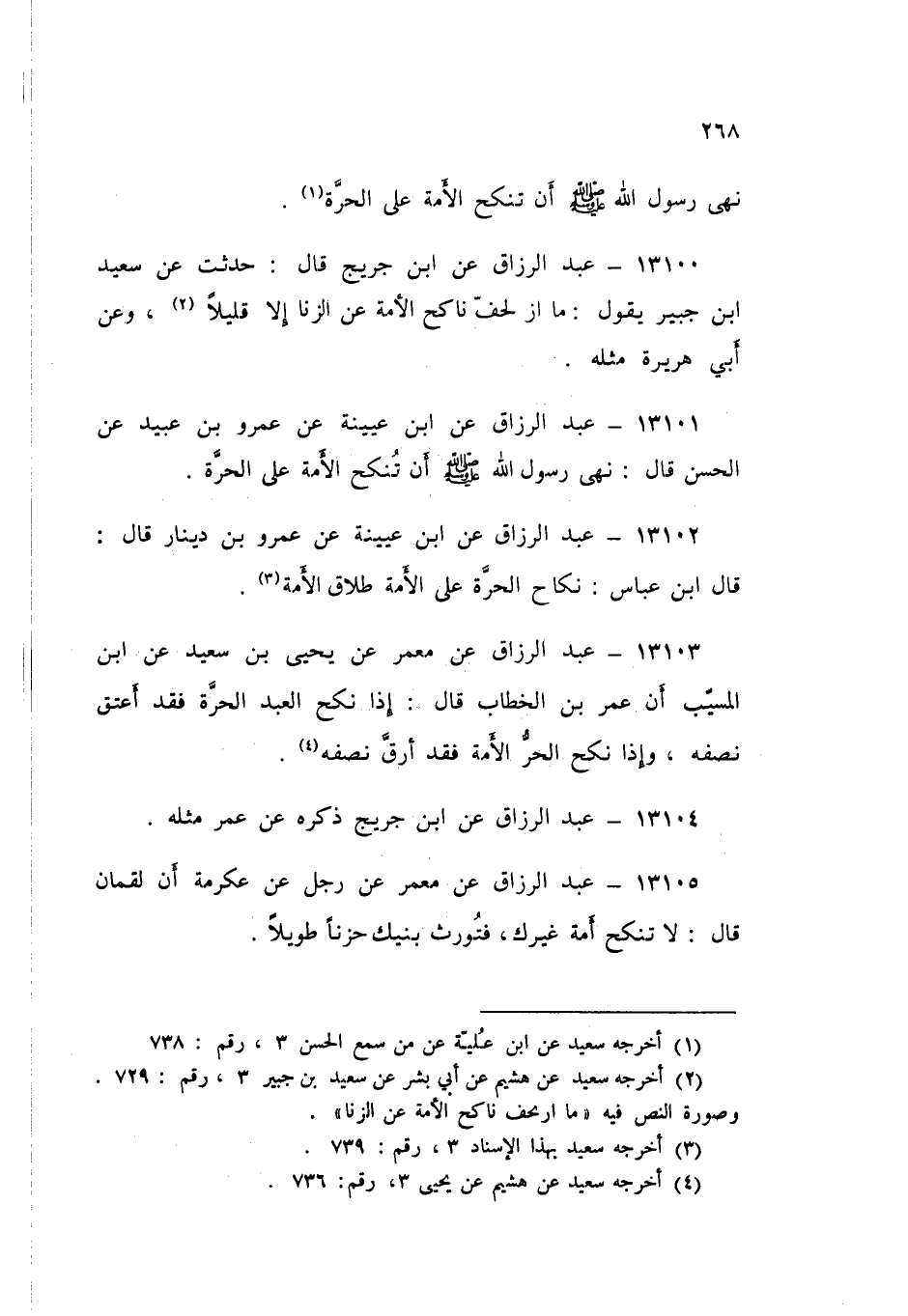 13101 - عَنِ ابْنِ عُيَيْنَةَ، عَنْ عَمْرِو بْنِ عُبَيْدٍ، عَنِ الْحَسَنِ قَالَ: «§نَهَى رَسُولُ اللَّهِ صَلَّى اللهُ عَلَيْهِ وَسَلَّمَ، أَنْ تُنْكَحَ الْأَمَةُ عَلَى الْحُرَّةِ»