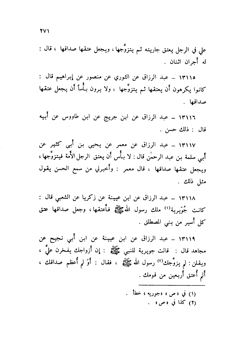 13118 - عَنِ ابْنِ عُيَيْنَةَ، عَنْ زَكَرِيَّا، عَنِ الشَّعْبِيِّ قَالَ: «كَانَتْ جُوَيْرِيَةُ مِلْكَ رَسُولِ اللَّهِ صَلَّى اللهُ عَلَيْهِ وَسَلَّمَ، §فَأَعْتَقَهَا، وَجَعَلَ صَدَاقَهَا عِتْقَ كُلِّ أَسِيرٍ مِنْ بَنِي الْمُصْطَلِقِ»