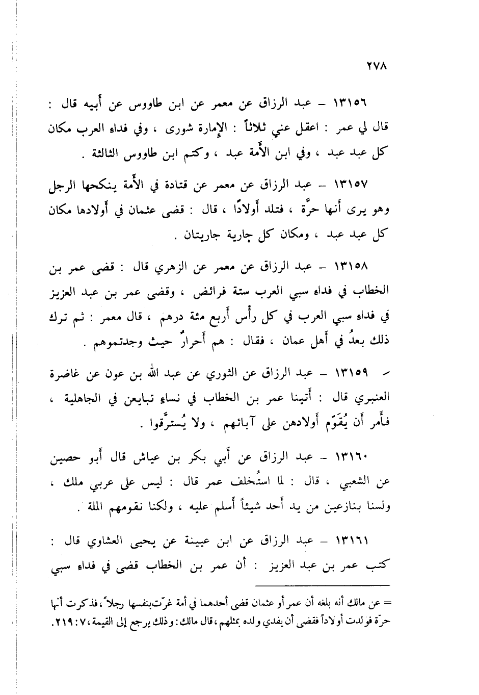 13158 - عَنْ مَعْمَرٍ، عَنِ الزُّهْرِيِّ قَالَ: قَضَى عُمَرُ بْنُ الْخَطَّابِ فِي «§فِدَاءِ سَبْيِ الْعَرَبِ سِتَّةَ فَرَائِضَ». وَقَضَى عُمَرُ بْنُ عَبْدِ الْعَزِيزِ فِي «فِدَاءِ سَبْيِ الْعَرَبِ فِي كُلِّ رَأْسِ أَرْبَعِمِائَةِ دِرْهَمٍ». قَالَ مَعْمَرٌ: " ثُمَّ تُرِكَ ذَلِكَ بَعْدُ فِي أَهْلِ عُمَانَ، فَقَالَ: هُمْ أَحْرَارٌ حَيْثُ وَجَدْتُمُوهُمْ "