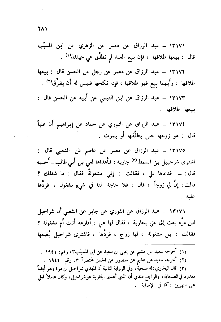 13176 - عَنِ الثَّوْرِيِّ، عَنْ جَابِرٍ، عَنِ الشَّعْبِيِّ، أَنَّ شَرَاحِيلَ بْنَ مُرَّةَ، بَعَثَ إِلَى عَلِيٍّ بِجَارِيَةٍ، فَقَالَ لَهَا عَلِيٌّ: «§أَفَارِغَةٌ أَنْتِ، أَمْ مَشْغُولَةٌ؟» فَقَالَتْ: بَلْ مَشْغُولَةٌ - لَهَا زَوْجٌ - فَرَدَّهَا، فَاشْتَرَى شَرَاحِيلُ بُضْعَهَا بِأَلْفٍ وَخَمْسِمِائَةِ دِرْهَمٍ، فَبَعَثَ بِهَا إِلَى عَلِيٍّ، فَقَبِلَهَا
