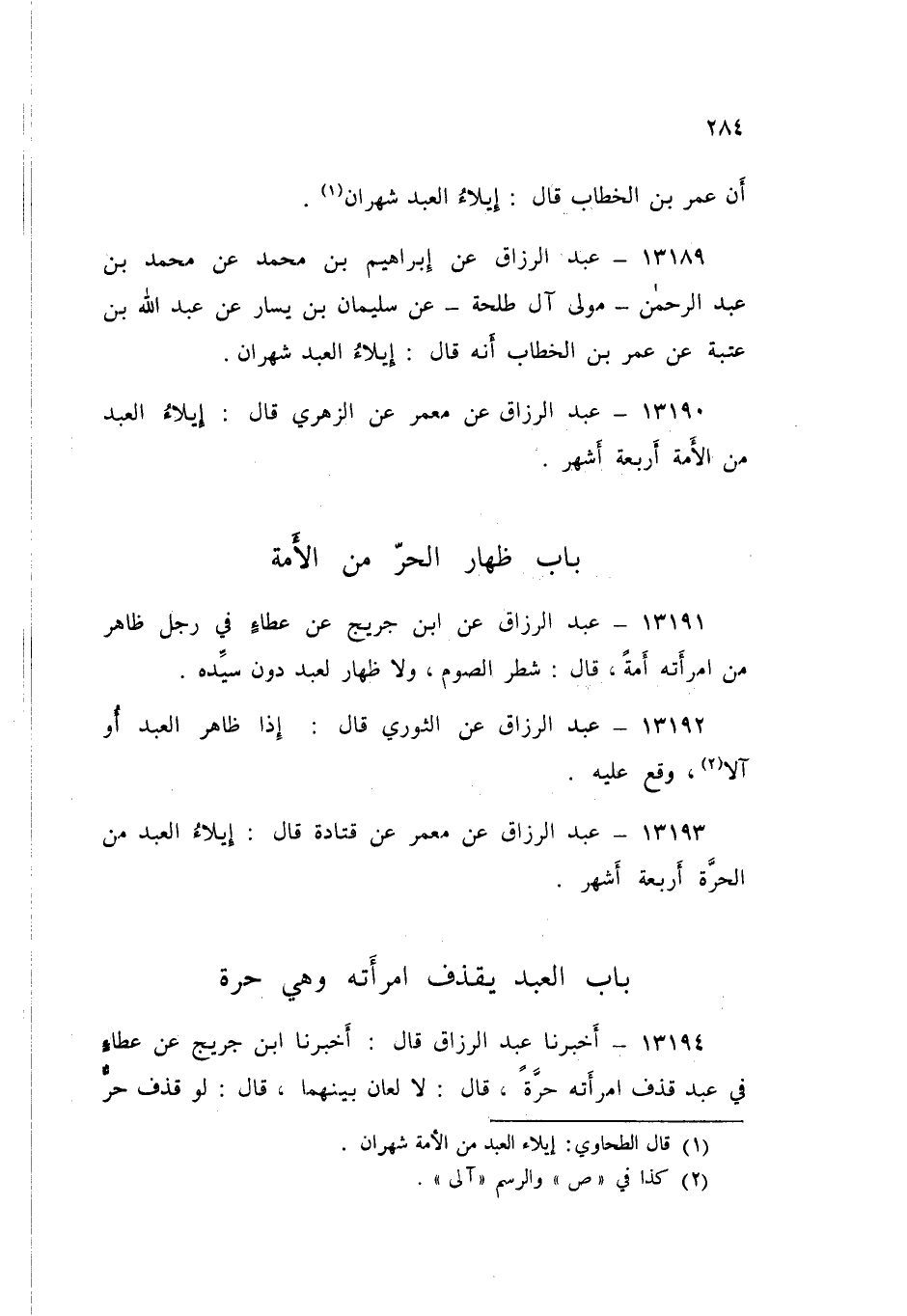 13190 - عَنْ مَعْمَرٍ، عَنِ الزُّهْرِيِّ قَالَ: «§إِيلَاءُ الْعَبْدِ مِنَ الْأَمَةِ أَرْبَعَةُ أَشْهُرٍ»