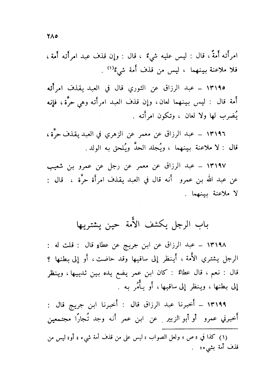 13199 - عَبْدُ الرَّزَّاقِ قَالَ: أَخْبَرَنَا ابْنُ جُرَيْجٍ قَالَ: أَخْبَرَنِي عَمْرٌو - أَوْ أَبُو الزُّبَيْرِ -، عَنِ ابْنِ عُمَرَ: " أَنَّهُ §وَجَدَ تُجَّارًا مُجْتَمِعِينَ عَلَى أَمَةٍ، فَكَشَفَ عَنْ بَعْضِ سَاقِهَا، وَوَضَعَ يَدَهُ عَلَى بَطْنِهَا