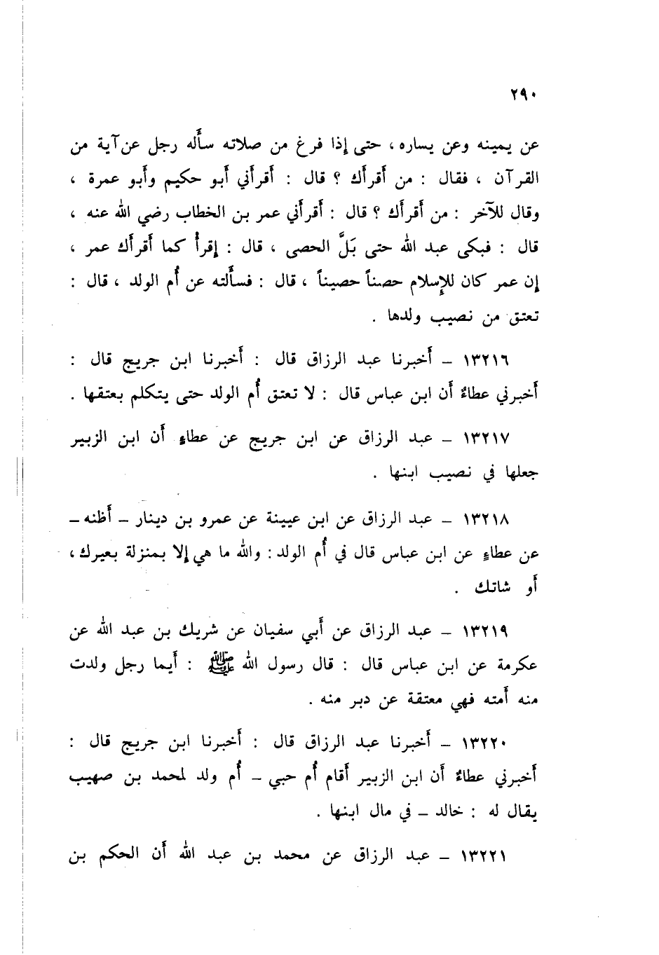 13220 - عَبْدُ الرَّزَّاقِ قَالَ: أَخْبَرَنَا ابْنُ جُرَيْجٍ قَالَ: أَخْبَرَنِي عَطَاءٌ، أَنَّ ابْنَ الزُّبَيْرِ، " §أَقَامَ أُمَّ حُبَيٍّ - أَمُّ وَلَدٍ لِمُحَمَّدِ بْنِ صُهَيْبٍ يُقَالُ لَهُ: خَالِدٌ - فِي مَالِ ابْنِهَا "