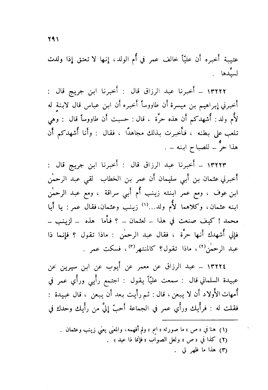 13223 - عَبْدُ الرَّزَّاقِ قَالَ: أَخْبَرَنَا ابْنُ جُرَيْجٍ قَالَ: أَخْبَرَنِي عُثْمَانُ بْنُ أَبِي سُلَيْمَانَ، أَنَّ عُمَرَ بْنَ الْخَطَّابِ، لَقِيَ عَبْدَ الرَّحْمَنِ بْنَ عَوْفٍ، وَمَعَ عُمَرَ ابْنَتُهُ زَيْنَبُ أُمُّ أَبِي سُرَاقَةَ، وَمَعَ عَبْدِ الرَّحْمَنِ ابْنُهُ عُثْمَانُ، وَكِلَاهُمَا لِأُمِّ وَلَدٍ - زَيْنَبُ وَعُثْمَانُ - فَقَالَ عُمَرُ: «يَا أَبَا مُحَمَّدٍ كَيْفَ صَنَعْتَ فِي هَذَا لِعُثْمَانَ؟ §فَأَمَّا هَذِهِ لِزَيْنَبَ فَإِنِّي أُشْهِدُكَ أَنَّهَا حُرَّةٌ»، فَقَالَ عَبْدُ الرَّحْمَنِ: مَاذَا تَقَوْلُ؟ فَإِنَّمَا ذَا عَبْدُ الرَّحْمَنِ مَاذَا تَقُولُ؟ كَالْمُنْتَهِرِ، فَسَكَتَ عُمَرُ