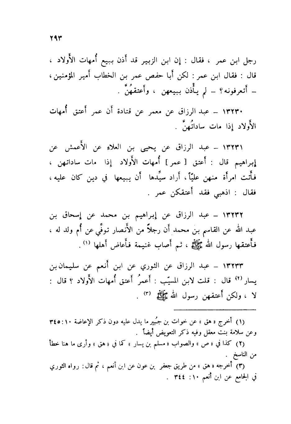 13233 - عَنِ الثَّوْرِيِّ، عَنِ ابْنِ أَنْعَمَ، عَنْ سُلَيْمَانَ بْنِ يَسَارٍ قَالَ: قُلْتُ لِابْنِ الْمُسَيِّبِ: أَعُمَرُ أَعْتَقَ أُمَّهَاتِ الْأَوْلَادِ؟ قَالَ: «لَا، وَلَكِنْ §أَعْتَقَهُنَّ رَسُولُ اللَّهِ صَلَّى اللهُ عَلَيْهِ وَسَلَّمَ»