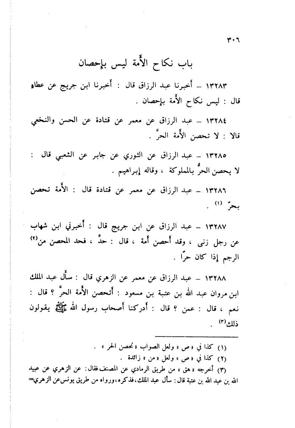 13283 - عَبْدُ الرَّزَّاقِ قَالَ: أَخْبَرَنَا ابْنُ جُرَيْجٍ، عَنْ عَطَاءٍ قَالَ: «§لَيْسَ نِكَاحُ الْأَمَةِ بِإِحْصَانٍ»