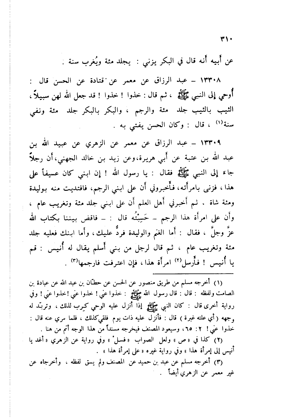 13309 - عَنْ مَعْمَرٍ، عَنِ الزُّهْرِيِّ، عَنْ عُبَيْدِ اللَّهِ بْنِ عَبْدِ اللَّهِ بْنِ عُتْبَةَ، عَنْ أَبِي هُرَيْرَةَ، وَعَنْ زَيْدِ بْنِ خَالِدٍ الْجُهَنِيِّ، أَنَّ رَجُلًا جَاءَ إِلَى النَّبِيِّ صَلَّى اللهُ عَلَيْهِ وَسَلَّمَ فَقَالَ: يَا رَسُولَ اللَّهِ إِنَّ ابْنِي كَانَ عَسِيفًا عَلَى هَذَا فَزَنَى بِامْرَأَتِهِ فَأَخْبَرُونِي أَنَّ عَلَى ابْنِي الرَّجْمَ، فَافْتَدَيْتُ مِنْهُ بِوَلِيدَةٍ وَمِائَةِ شَاةٍ، ثُمَّ أَخْبَرَنِي أَهْلُ الْعِلْمِ أَنَّ عَلَى ابْنِي جَلْدَ مِائَةٍ، وَتَغْرِيبَ عَامٍ، وَأَنَّ عَلَى امْرَأَةِ هَذَا الرَّجْمَ حَسِبْتُهُ قَالَ: فَاقْضِ بَيْنَنَا بِكِتَابِ اللَّهِ عَزَّ وَجَلَّ فَقَالَ: «§أَمَّا الْغَنَمُ وَالْوَلِيدَةُ، فَرْدٌ عَلَيْكَ، وَأَمَّا ابْنُكَ فَعَلَيْهِ جَلْدُ مِائَةٍ، وَتَغْرِيبُ عَامٍ»، ثُمَّ قَالَ لِرَجُلٍ مِنْ بَنِي أَسْلَمَ يُقَالُ لَهُ أُنَيْسٌ: «قُمْ يَا أُنَيْسُ فَأَرْسِلِ امْرَأَةَ هَذَا، فَإِنِ اعْتَرَفَتْ فَارْجُمْهَا»
