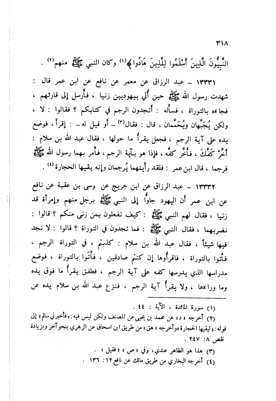 13331 - عَنْ مَعْمَرٍ، عَنْ نَافِعٍ، عَنِ ابْنِ عُمَرَ قَالَ: شَهِدْتُ رَسُولَ اللَّهِ صَلَّى اللهُ عَلَيْهِ وَسَلَّمَ حِينَ أُتِيَ بِيَهُودِيَّيْنِ زَنَيَا، فَأَرْسَلَ إِلَى قَارِئِهِمْ، فَجَاءَهُ بِالتَّوْرَاةِ فَسَأَلَهُ: «§أَتَجِدُونَ الرَّجْمَ فِي كِتَابِكُمْ؟» فَقَالُوا: لَا، وَلَكِنْ يُجَبَّهَانِ وَيُحَمَّمَانِ قَالَ: فَقَالَ - أَوْ قِيلَ لَهُ -: «اقْرَأْ» فَوَضَعَ يَدَهُ عَلَى آيَةِ الرَّجْمِ، فَجَعَلَ يَقْرَأُ مَا حَوْلَهَا. فَقَالَ عَبْدُ اللَّهِ بْنُ سَلَامٍ: أَخِّرْ كَفَّكَ، فَأَخَّرَ كَفَّهُ، فَإِذَا هُوَ بِآيَةِ الرَّجْمِ، فَأَمَرَ بِهِمَا رَسُولُ اللَّهِ صَلَّى اللهُ عَلَيْهِ وَسَلَّمَ فَرُجِمَا. قَالَ ابْنُ عُمَرَ: «فَلَقَدْ رَأَيْتُهُمَا يُرْجَمَانِ، وَإِنَّهُ يَقِيهَا الْحِجَارَةَ»