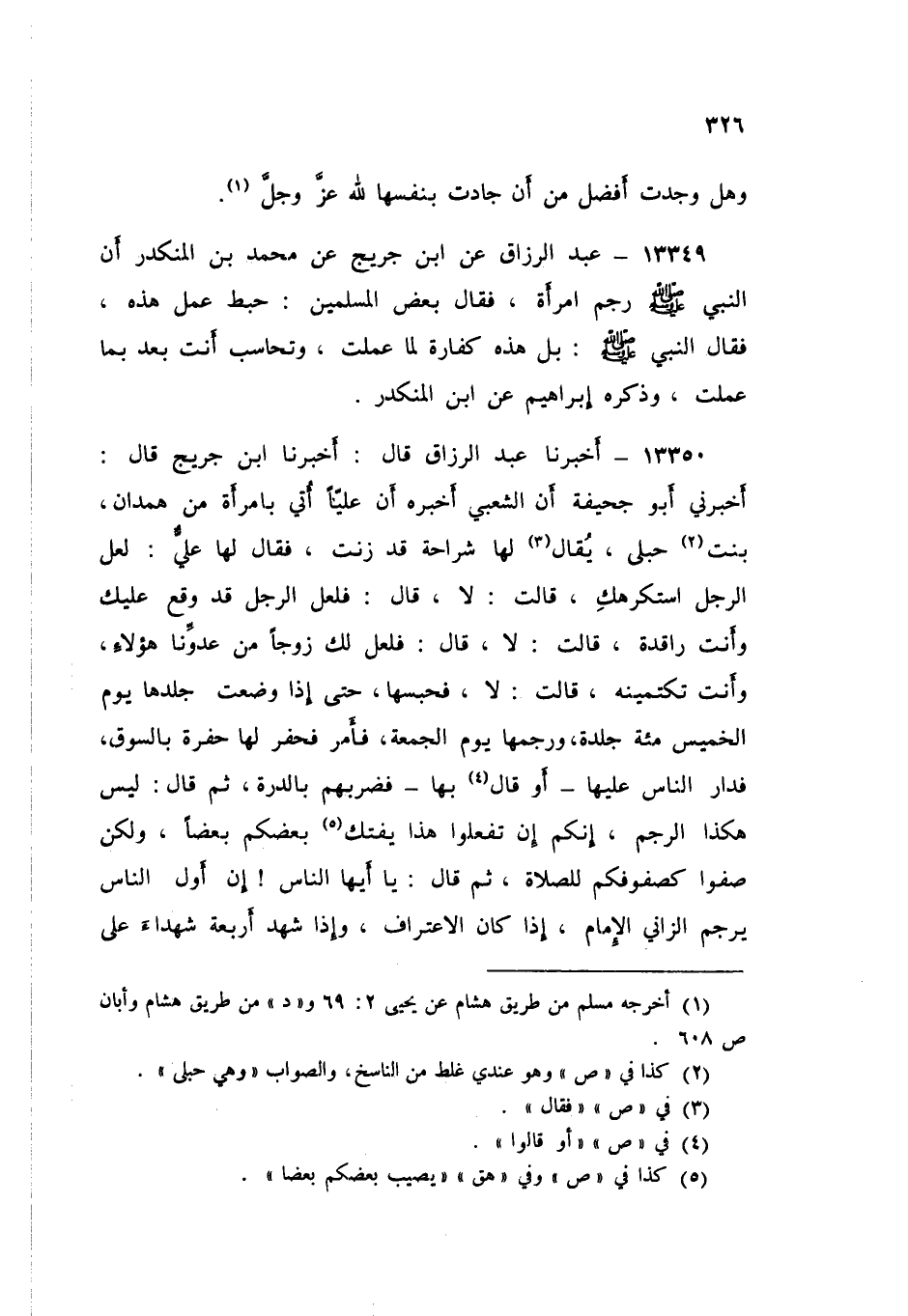 13350 - عَبْدُ الرَّزَّاقِ قَالَ: أَخْبَرَنَا ابْنُ جُرَيْجٍ قَالَ: أَخْبَرَنِي أَبُو جُحَيْفَةَ، أَنَّ الشَّعْبِيَّ، أَخْبَرَهُ، أَنَّ عَلِيًّا أُتِيَ بِامْرَأَةٍ مِنْ هَمْدَانَ حُبْلَى، يقَالَ لَهَا شَرَاحَةُ: قَدْ زَنَتْ. فَقَالَ لَهَا عَلِيٌّ: «لَعَلَّ الرَّجُلَ اسْتَكْرَهَكِ؟» قَالَتْ: لَا. قَالَ: «فَلَعَلَّ الرَّجُلَ قَدْ وَقَعَ عَلَيْكِ، وَأَنْتِ رَاقِدَةٌ؟» قَالَتْ: لَا. قَالَ: «فَلَعَلَّ لَكِ زَوْجًا مِنْ عَدُوِّنَا هَؤُلَاءِ، وَأَنْتِ تَكْتُمِينَهُ؟» قَالَتْ: لَا. فَحَبَسَهَا حَتَّى إِذَا وَضَعَتْ جَلَدَهَا يَوْمَ الْخَمِيسِ مِائَةَ جَلْدَةً، وَرَجَمَهَا يَوْمَ الْجُمُعَةِ، فَأَمَرَ فَحُفِرَ لَهَا حُفْرَةً بِالسُّوقِ فَدَارَ النَّاسُ عَلَيْهَا - أَوْ قَالَ: بِهَا فَضَرَبَهُمْ بِالدِّرَّةِ -، ثُمَّ قَالَ: «لَيْسَ هَكَذَا الرَّجْمُ، إِنَّكُمْ إِنْ تَفْعَلُوا هَذَا يَفْتِكْ بَعْضُكُمْ بَعْضًا، وَلَكِنْ صُفُّوا كَصُفُوفِكُمُ لِلصَّلَاةِ»، ثُمَّ قَالَ: " يَا أَيُّهَا النَّاسُ، إِنَّ §أَوَّلَ النَّاسِ يَرْجِمُ الزَّانِيَ: الْإِمَامُ إِذَا كَانَ الِاعْتِرَافُ، وَإِذَا شَهِدَ أَرْبَعَةُ شُهَدَاءَ عَلَى الزِّنَا. أَوَّلُ النَّاسِ يُرْجَمُ الشُّهُودُ بِشَهَادِتِهِمْ عَلَيْهِ، ثُمَّ الْإِمَامُ، ثُمَّ النَّاسُ، ثُمَّ رَمَاهَا بِحَجَرٍ، وَكَبَّرَ " ثُمَّ أَمَرَ الصَّفَّ الْأَوَّلَ فَقَالَ: «ارْمُوا» ثُمَّ قَالَ: «انْصَرِفُوا، وَكَذَلِكَ صَفًّا صِفًّا حَتَّى قَتَلُوهَا»