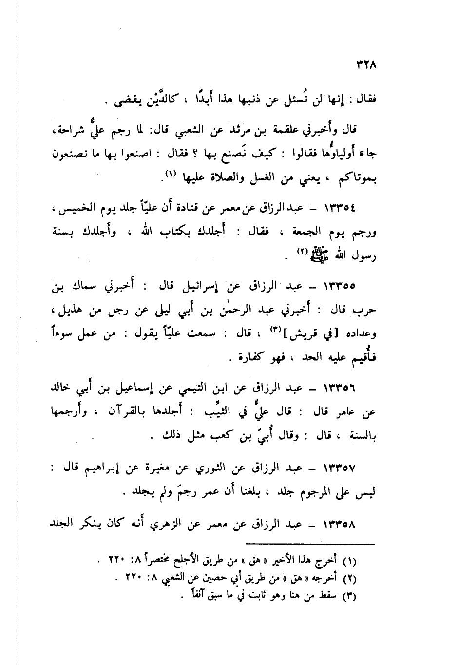 13357 - عَنِ الثَّوْرِيِّ، عَنْ مُغِيرَةَ، عَنْ إِبْرَاهِيمَ قَالَ: لَيْسَ عَلَى الْمَرْجُومِ جَلْدٌ، بَلَغَنَا أَنَّ عُمَرَ «§رَجَمَ وَلَمْ يَجْلِدْ»