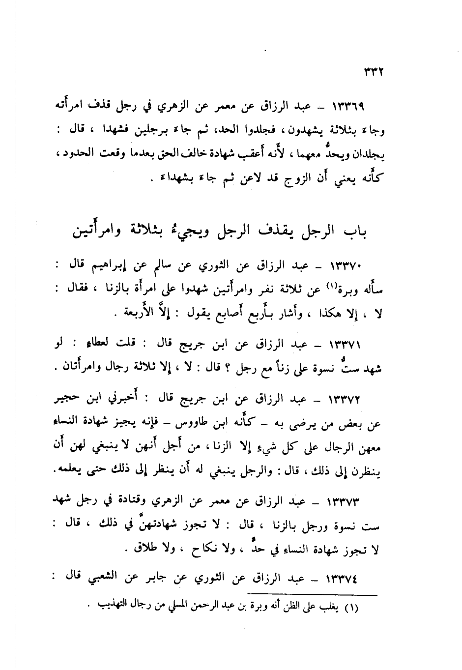 13370 - عَنِ الثَّوْرِيِّ، عَنْ سَالِمٍ، عَنْ إِبْرَاهِيمَ قَالَ: سَأَلَهُ وَبْرَةُ عَنْ §ثَلَاثِ نَفَرٍ وَامْرَأَتَيْنِ شَهِدُوا عَلَى امْرَأَةٍ بِالزِّنَا، فَقَالَ: «لَا، إِلَّا هَكَذَا» - وَأَشَارَ بِأَرْبَعِ أَصَابِعَ - يَقُولُ: «إِلَّا الْأَرْبَعَةَ»