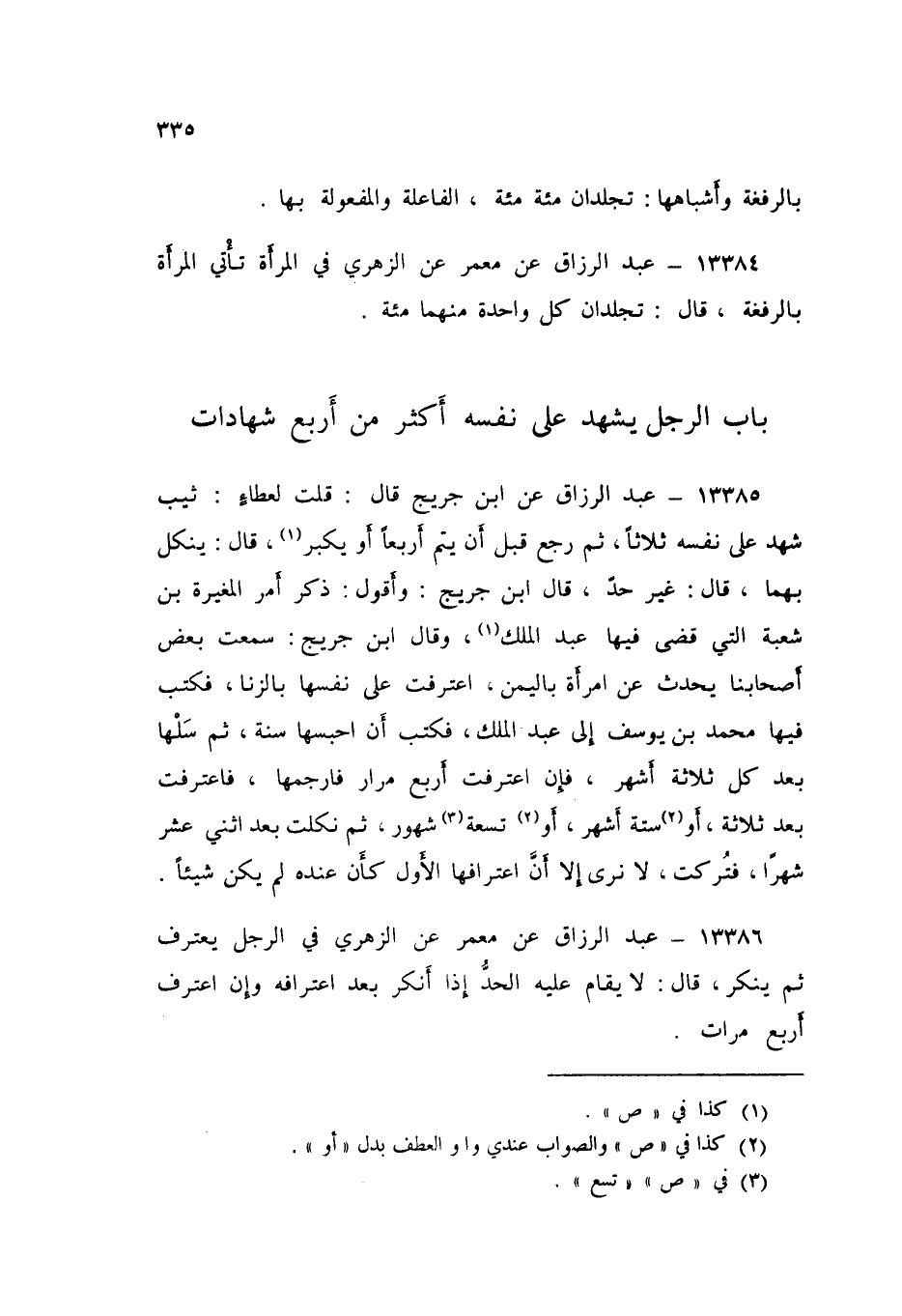13385 - عَنِ ابْنِ جُرَيْجٍ قَالَ: قُلْتُ لِعَطَاءٍ: ثَيِّبٌ شَهِدَ عَلَى نَفْسِهِ ثَلَاثًا، ثُمَّ رَجَعَ قَبْلَ أَنْ يُتِمَّ أَرْبَعًا أَوْ يُكَبِّرَ قَالَ: يُنَكَّلُ بِهِمَا. قَالَ: غَيْرُ حَدٍّ، قَالَ ابْنُ جُرَيْجٍ: وَأَقُولُ: ذَكَرَ أَمْرَ الْمُغِيرَةِ بْنِ شُعْبَةَ الَّتِي قَضَى فِيهَا عَبْدُ الْمَلِكِ. وَقَالَ ابْنُ جُرَيْجٍ: سَمِعْتُ بَعْضَ أَصْحَابِنَا، يُحَدِّثُ، عَنِ امْرَأَةٍ بِالْيَمَنِ اعْتَرَفَتْ عَلَى نَفْسِهَا بِالزِّنَا، فَكَتَبَ فِيهَا مُحَمَّدُ بْنُ يُوسُفَ إِلَى عَبْدِ الْمَلِكِ فَكَتَبَ أَنِ §احْبِسْهَا سَنَةً، ثُمَّ سَلْهَا بَعْدَ كُلِّ ثَلَاثَةِ أَشْهُرٍ، فَإِنِ اعْتَرَفَتْ أَرْبَعَ مِرَارٍ فَارْجُمْهَا، فَاعْتَرَفَتْ بَعْدَ ثَلَاثَةٍ أَوْ سِتَّةِ أَشْهُرٍ أَوْ تِسْعَةِ شُهُورٍ، ثُمَّ نَكَلَتْ بَعْدَ اثْنَيْ عَشَرَ شَهْرًا، فَتُرِكَتْ لَا نَرَى إِلَّا أَنَّ اعْتِرَافَهَا الْأَوَّلَ كَانَ عِنْدَهُ لَمْ يَكُنْ شَيْئًا "