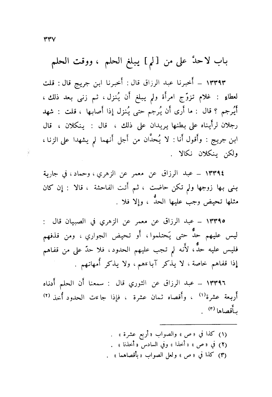 13396 - عَنِ الثَّوْرِيِّ قَالَ: «سَمِعْنَا أَنَّ §الْحُلُمَ أَدْنَاهُ أَرْبَعَ عَشْرَةَ، وَأَقْصَاهُ ثَمَانِ عَشْرَةَ، فَإِذَا جَاءَتِ الْحُدُودُ أُخِذَ بِأَقْصَاهَا»