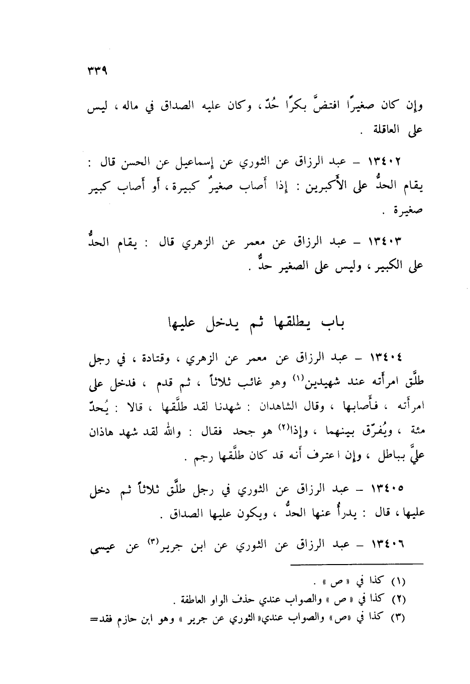 13406 - عَنِ الثَّوْرِيِّ، عَنِ ابْنِ جَرِيرٍ، عَنْ عِيسَى، عَنْ عَاصِمٍ، عَنْ شُرَيْحٍ، أَنَّ رَجُلًا طَلَّقَ امْرَأَتَهُ ثَلَاثًا، فَشَهِدَ عَلَيْهِ قَوْمٌ أَنَّهُ يُجَامِعُهَا بَعْدَ ذَلِكَ قَالَ: «§إِنْ شِئْتُمْ شَهَدْتُمْ أَنَّهُ زَانٍ»