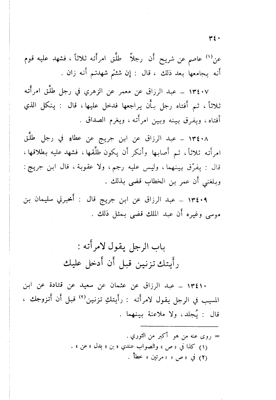 13408 - عَنِ ابْنِ جُرَيْجٍ، عَنْ عَطَاءٍ فِي §رَجُلٍ طَلَّقَ امْرَأَتَهُ ثَلَاثًا، ثُمَّ أَصَابَهَا، وَأَنْكَرَ أَنْ يَكُونَ طَلَّقَهَا، فَشَهِدَ عَلَيْهِ بِطَلَاقِهَا قَالَ: «يُفَرَّقُ بَيْنَهُمَا، وَلَيْسَ عَلَيْهِ رَجْمٌ، وَلَا عُقُوبَةٌ». قَالَ ابْنُ جُرَيْجٍ: وَبَلَغَنِي أَنَّ عُمَرَ بْنَ الْخَطَّابِ قَضَى بِذَلِكَ. عَبْدُ الرَّزَّاقِ،