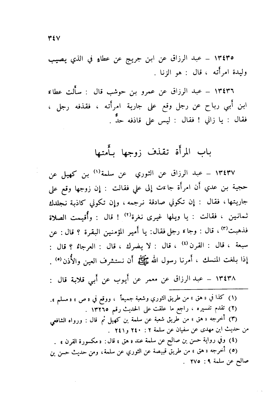 13436 - عَنْ عَمْرِو بْنِ حَوْشَبٍ قَالَ: سَأَلْتُ عَطَاءَ بْنَ أَبِي رَبَاحٍ، عَنْ رَجُلٍ وَقَعَ عَلَى جَارِيَةِ امْرَأَتِهِ، فَقَذَفَهُ رَجُلٌ، فَقَالَ: يَا زَانِي. فَقَالَ: «§لَيْسَ عَلَى قَاذِفِهِ حَدٌّ»