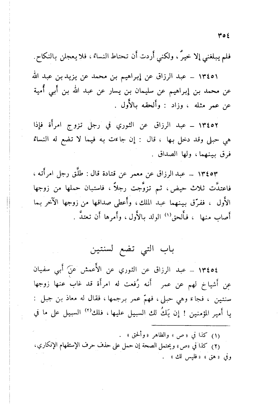 13454 - عَنِ الثَّوْرِيِّ، عَنِ الْأَعْمَشِ، عَنْ أَبِي سُفْيَانَ، عَنِ أَشْيَاخٍ لَهُمْ، عَنْ عُمَرَ، أَنَّهُ رُفِعَتْ لَهُ امْرَأَةٌ قَدْ غَابَ عَنْهَا زَوْجُهَا سَنَتَيْنِ فَجَاءَ وَهِيَ حُبْلَى فَهَمَّ عُمَرُ بِرَجْمِهَا، فَقَالَ لَهُ مُعَاذُ بْنُ جَبَلٍ: يَا أَمِيرَ الْمُؤْمِنِينَ §إِنْ يَكُ لَكَ السَّبِيلُ عَلَيْهَا فَلَيْسَ لَكَ السَّبِيلُ عَلَى مَا فِي بَطْنِهَا، فَتَرَكَهَا عُمَرُ حَتَّى وَلَدَتْ غُلَامًا قَدْ نَبَتَتْ ثَنَايَاهُ، فَعَرَفَ زَوْجُهَا شَبَهَهُ بِهِ، قَالَ عُمَرُ: «عَجَزَ النِّسَاءُ أَنْ يَلِدْنَ مِثْلَ مُعَاذٍ، لَوْلَا مُعَاذٌ هَلَكَ عُمَرُ»