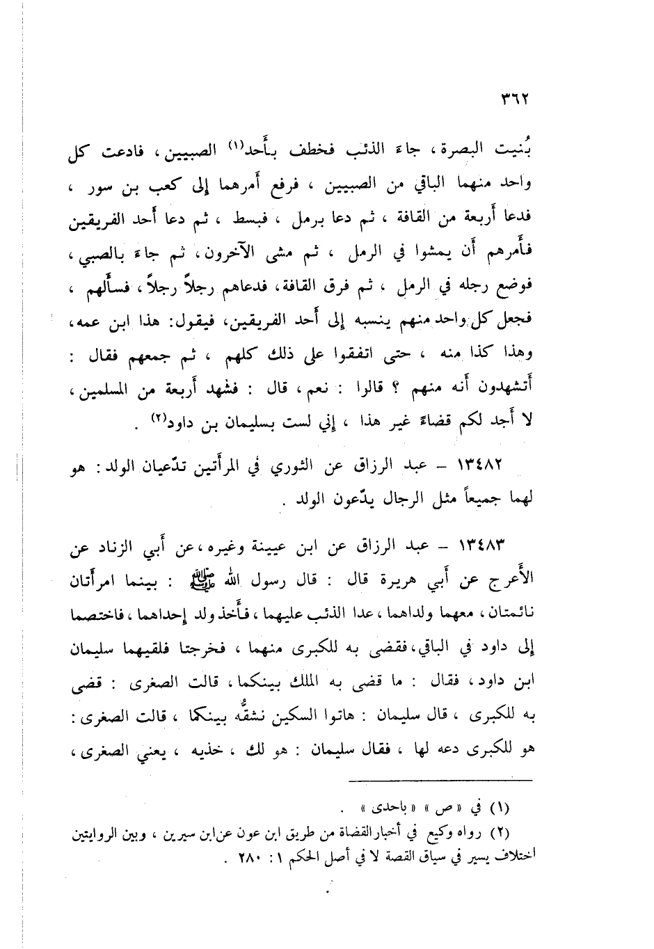 13483 - عَنِ ابْنِ عُيَيْنَةَ، وَغَيْرِهِ، عَنِ أَبِي الزِّنَادِ، عَنِ الْأَعْرَجِ، عَنْ أَبِي هُرَيْرَةَ قَالَ: قَالَ رَسُولُ اللَّهِ صَلَّى اللهُ عَلَيْهِ وَسَلَّمَ: " §بَيْنَمَا امْرَأَتَانِ نَائِمَتَانِ مَعَهُمَا وَلَدَاهُمَا عَدَا الذِّئْبُ عَلَيْهِمَا، فَأَخَذَ وَلَدَ إِحْدَاهُمَا فَاخْتَصَمَا إِلَى دَاوُدَ فِي الْبَاقِي، فَقَضَى بِهِ لِلْكُبْرَى مِنْهُمَا فَخَرَجَتَا فَلَقِيَهُمَا سُلَيْمَانُ بْنُ دَاوُدَ فَقَالَ: مَا قَضَى بِهِ الْمَلِكُ بَيْنَكُمَا قَالَتْ: الصُّغْرَى قَضَى بِهِ لِلْكُبْرَى قَالَ سُلَيْمَانُ: هَاتُوا السِّكِّينَ نَشُقُّهُ بَيْنَكُمَا قَالَتْ: الصُّغْرَى هُوَ لِلْكُبْرَى دَعْهُ لَهَا فَقَالَ سُلَيْمَانُ: هُوَ لَكِ خُذْيهِ - يَعْنِي الصُّغْرَى - حِينَ رَأَى رَحْمَتَهَا لَهُ ". قَالَ أَبُو هُرَيْرَةَ: «وَمَا سَمِعْتُ بِالسِّكِّينِ قَطْ إِلَّا يَوْمَئِذٍ مِنْ رَسُولِ اللَّهِ صَلَّى اللهُ عَلَيْهِ وَسَلَّمَ، مَا كُنَّا نَسَمِّيهِ إِلَّا الَمُدْيَةُ»