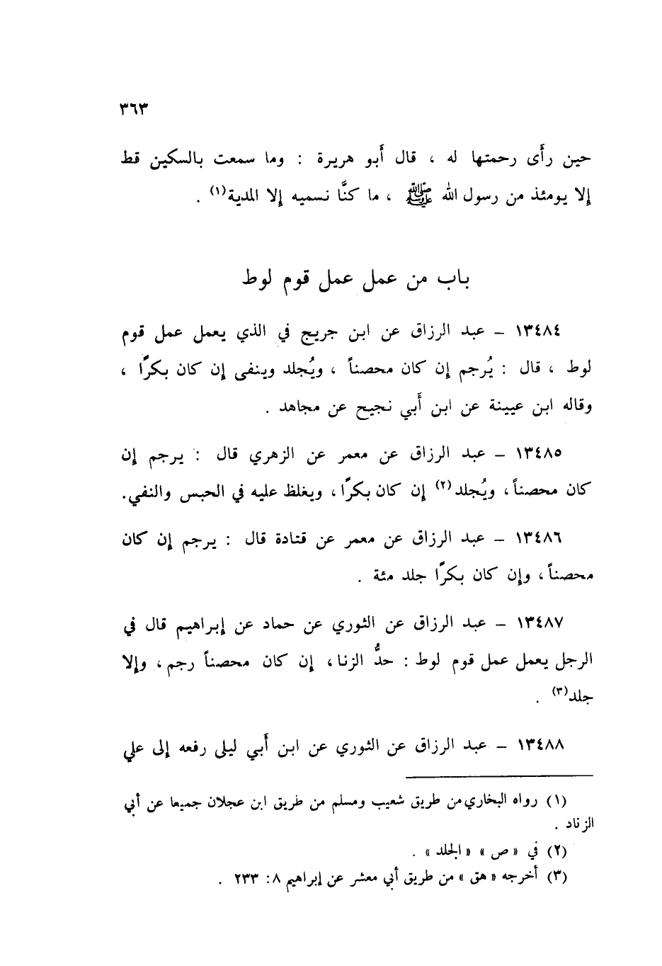 13487 - عَنِ الثَّوْرِيِّ، عَنْ حَمَّادٍ، عَنْ إِبْرَاهِيمَ قَالَ: «فِي §الرَّجُلِ يَعْمَلُ عَمَلَ قَوْمِ لُوطٍ حَدُّ الزِّنَا، إِنْ كَانَ مُحْصَنًا رُجِمَ، وَإِلَّا جُلِدَ»