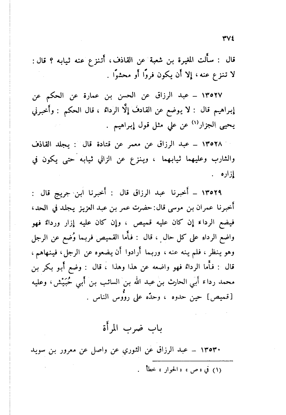 13529 - عَبْدُ الرَّزَّاقِ قَالَ: أَخْبَرَنَا ابْنُ جُرَيْجٍ قَالَ: أَخْبَرَنَا عِمْرَانُ بْنُ مُوسَى قَالَ: حَضَرْتُ عُمَرَ بْنَ عَبْدِ الْعَزِيزِ يَجْلِدُ فِي الْحَدِّ، فَيَضَعُ الرِّدَاءَ إِنْ كَانَ عَلَيْهِ قَمِيصٌ، وَإِنْ كَانَ عَلَيْهِ إِزَارٌ، وَردَاءٌ فَهُوَ وَاضِعٌ الرِّدَاءَ عَلَى كُلِّ حَالٍ قَالَ: " §فَأمَا الْقَمِيصُ فَرُبُّمَا وُضِعَ عَنِ الرَّجُلِ، وَهُوَ يَنْظُرُ فَلَمْ يَنْهَ عَنْهُ، وَرُبُّمَا أَرَادُوا أَنْ يَضَعُوهُ، عَنِ الرَّجُلِ فَيَنْهَاهُمْ قَالَ: فَأَمَّا الرِّدَاءُ فَهُوَ وَاضِعُهُ عَنْ هَذَا وَهَذَا " قَالَ: «وَضَعَ أَبُو بَكْرِ بْنُ مُحَمَّدٍ رِدَاءَ أَبِي الْحَارِثِ بْنِ عَبْدِ اللَّهِ بْنِ السَّائِبِ بْنِ أَبِي حُبَيْشٍ وَعَلَيْهِ قَمِيصٌ حِينَ حَدُّوهُ وَحَدَّهُ عَلَى رُءُوسِ النَّاسِ»