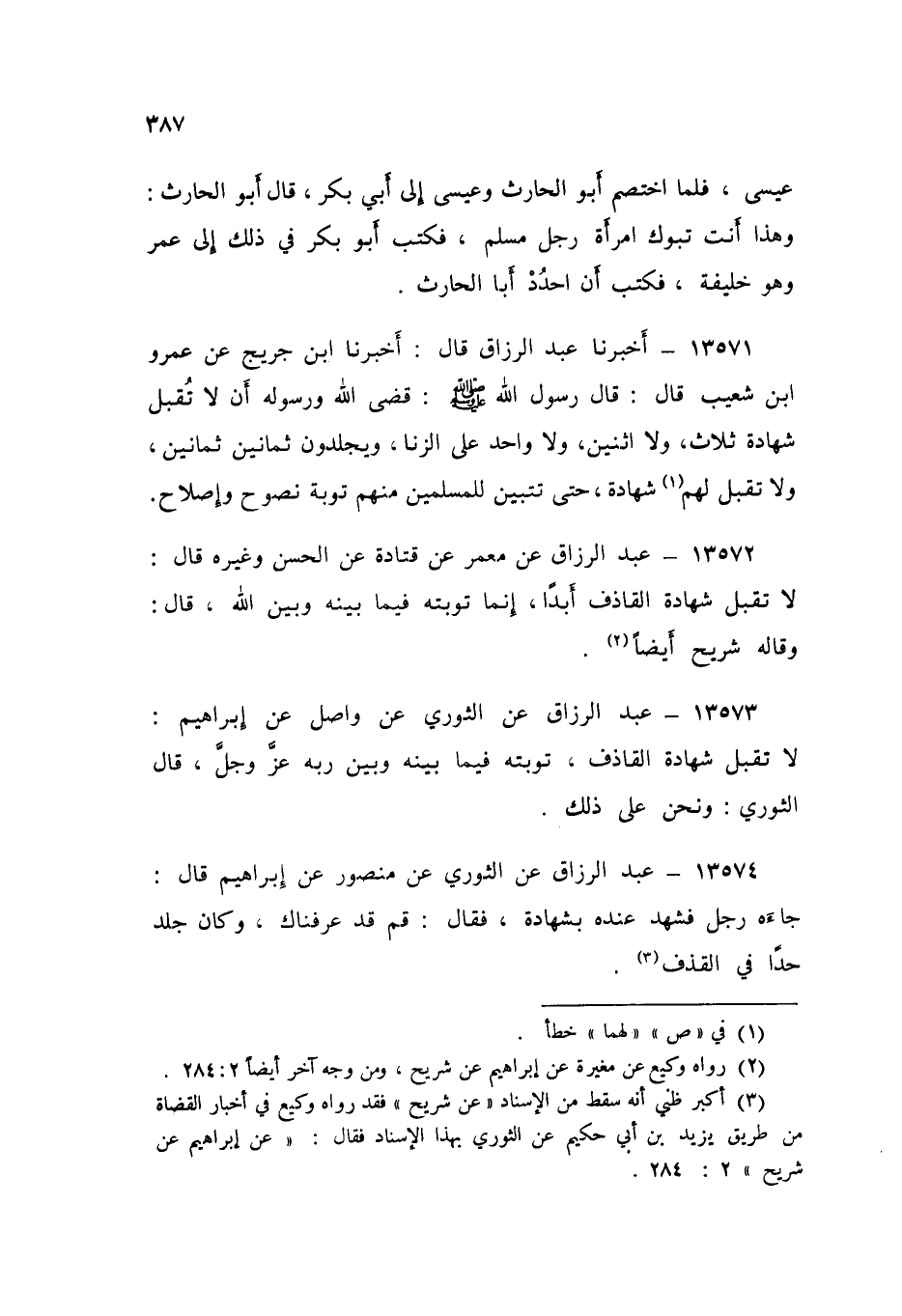 13571 - عَبْدُ الرَّزَّاقِ قَالَ: أَخْبَرَنَا ابْنُ جُرَيْجٍ، عَنْ عَمْرِو بْنِ شُعَيْبٍ قَالَ: قَالَ رَسُولُ اللَّهِ صَلَّى اللهُ عَلَيْهِ وَسَلَّمَ: «قَضَى اللَّهُ وَرَسُولُهُ أَنْ §لَا تُقْبَلَ شَهَادَةُ ثَلَاثٍ، وَلَا اثْنَيْنِ، وَلَا وَاحِدٍ عَلَى الزِّنَا، وَيُجْلَدُونَ ثَمَانِينَ ثَمَانِينَ، وَلَا تُقْبَلُ لَهُمْ شَهَادَةٌ حَتَّى تَتَبَيَّنَ لِلْمُسْلِمِينَ مِنْهُمْ تَوْبَةٌ نَصُوحٌ وَإِصْلَاحٌ»