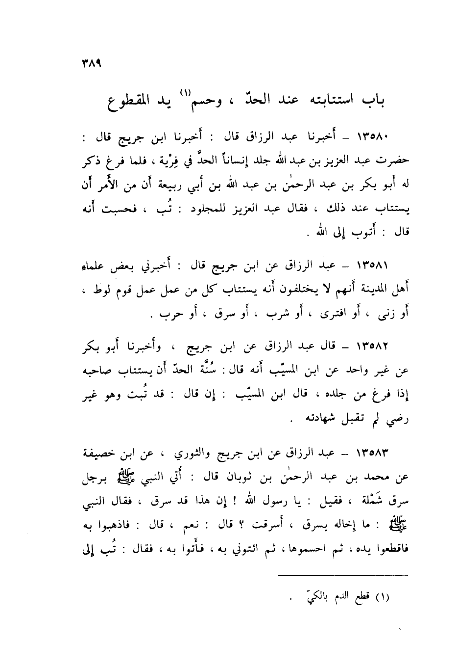 13583 - عَنِ ابْنِ جُرَيْجٍ، وَالثَّوْرِيِّ، عَنِ ابْنِ خُصَيْفَةَ، عَنْ مُحَمَّدِ بْنِ عَبْدِ الرَّحْمَنِ بْنِ ثَوْبَانَ قَالَ: أُتِيَ النَّبِيَّ صَلَّى اللهُ عَلَيْهِ وَسَلَّمَ بِرَجُلٍ سَرَقَ شَمْلَةً فَقِيلَ: يَا رَسُولَ اللَّهِ إِنَّ هَذَا قَدْ سَرَقَ؟ فَقَالَ النَّبِيُّ صَلَّى اللهُ عَلَيْهِ وَسَلَّمَ: «§مَا إِخَالُهُ يَسْرِقُ، أَسَرَقْتَ؟» قَالَ: نَعَمْ. قَالَ: «فَاذْهَبُوا بِهِ فَاقْطَعُوا يَدَهُ، ثُمَّ احْسِمُوهَا، ثُمَّ ائْتُونِي بِهِ» فَأَتَوْا بِهِ، فَقَالَ: «تُبْ إِلَى اللَّهِ عَزَّ وَجَلَّ». قَالَ: فَإِنِّي أَتُوبُ إِلَى اللَّهِ. قَالَ: «اللَّهُمَّ تُبْ عَلَيْهِ». عَبْدُ الرَّزَّاقِ،