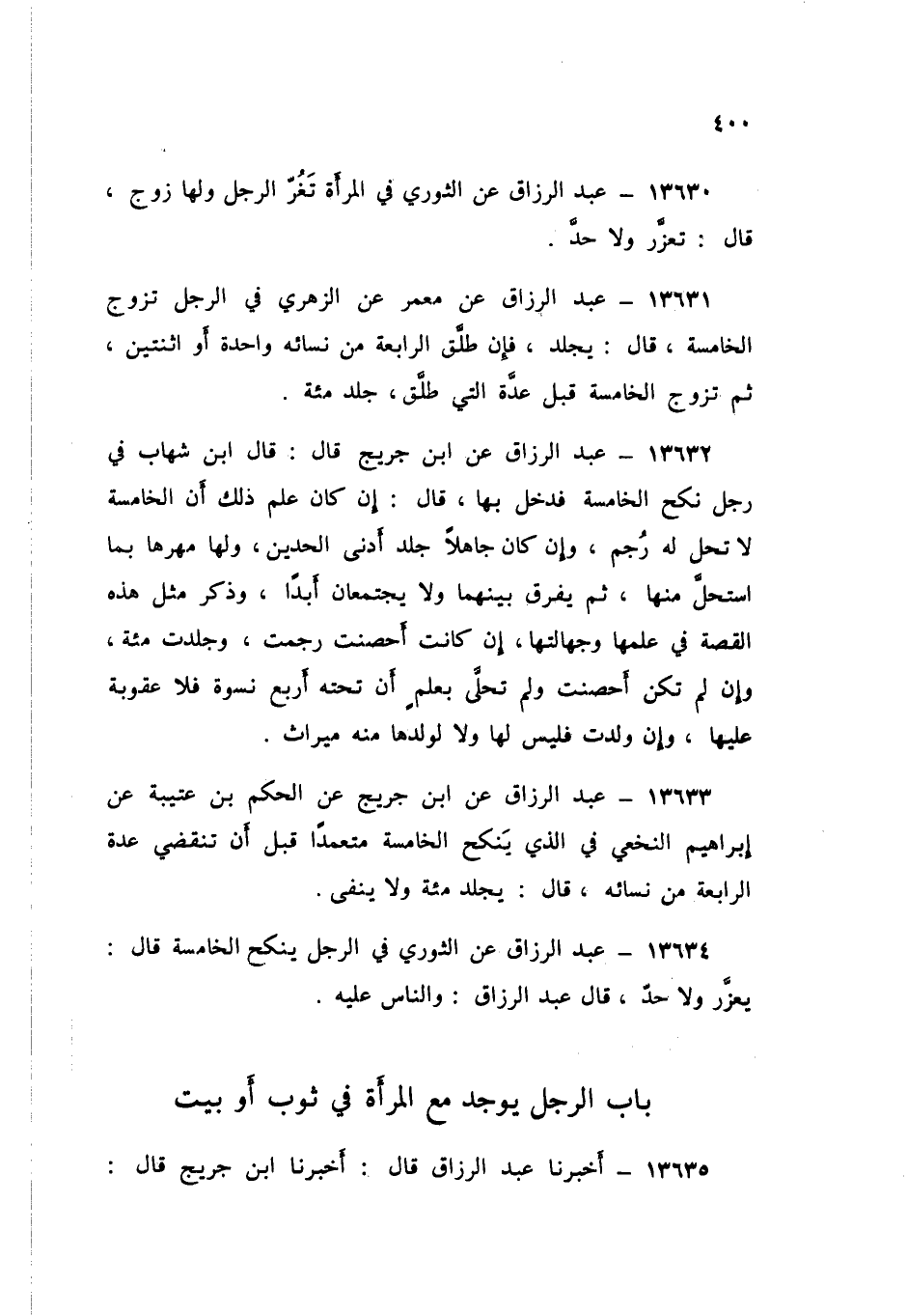 13634 - عَنِ الثَّوْرِيِّ فِي §الرَّجُلِ يَنْكِحُ الْخَامِسَةَ قَالَ: «يُعَزَّرُ وَلَا حَدَّ». قَالَ عَبْدُ الرَّزَّاقِ: «وَالنَّاسُ عَلَيْهِ»