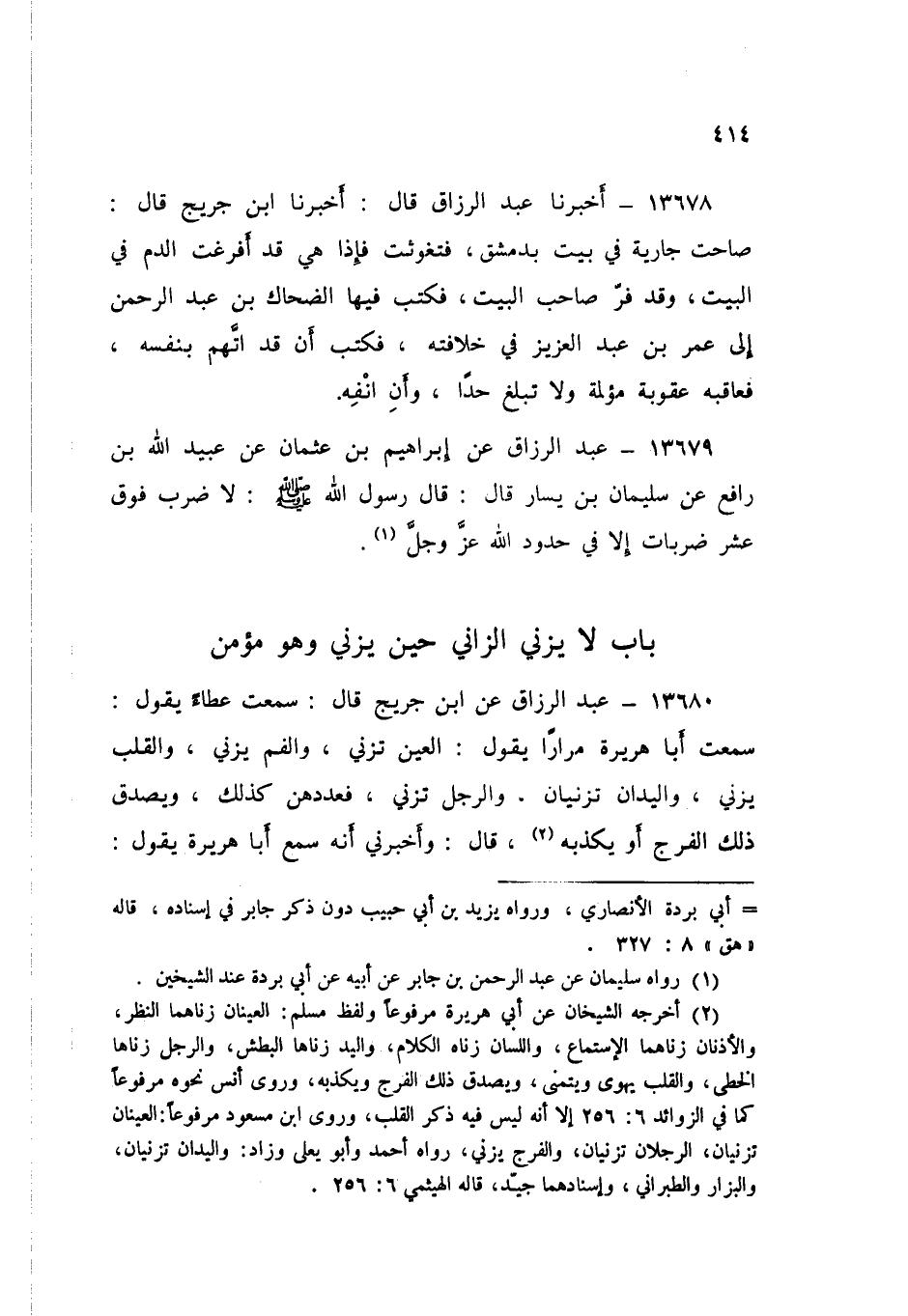 13680 - عَنِ ابْنِ جُرَيْجٍ قَالَ: سَمِعْتُ عَطَاءً يَقُولُ: سَمِعْتُ أَبَا هُرَيْرَةَ، مِرَارًا يَقُولُ: «§الْعَيْنُ تَزْنِي، وَالْفَمُ يَزْنِي، وَالْقَلْبُ يَزْنِي، وَالْيَدَانِ تَزْنِيَانِ، وَالرِّجْلُ تَزْنِي فَعَدَّدَهُنَّ كَذَلِكَ، وَيُصَدِّقُ ذَلِكَ الْفَرْجُ أَوْ يُكَذِّبُهُ»